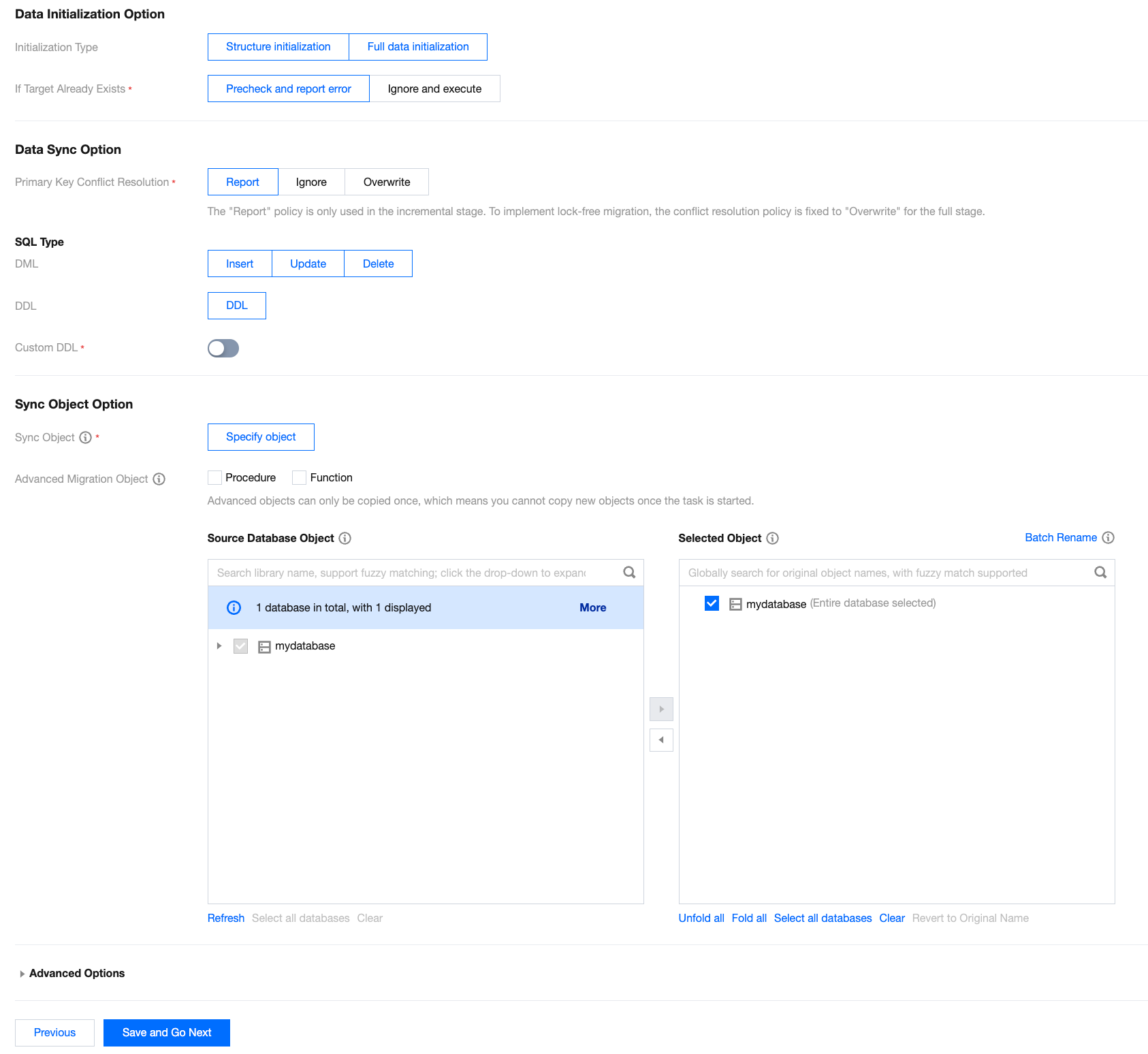 初期化タイプで全データ初期化のみを選択した場合、システムは対象データベースにテーブル構造が既に作成されているとみなし、テーブル構造の同期は行わず、ソースと対象データベースの同名テーブル有無もチェックしません。したがって、ユーザーが同時に既存の同名テーブルで事前チェックとエラー報告を選択しても、チェックとエラー報告機能は有効になりません。