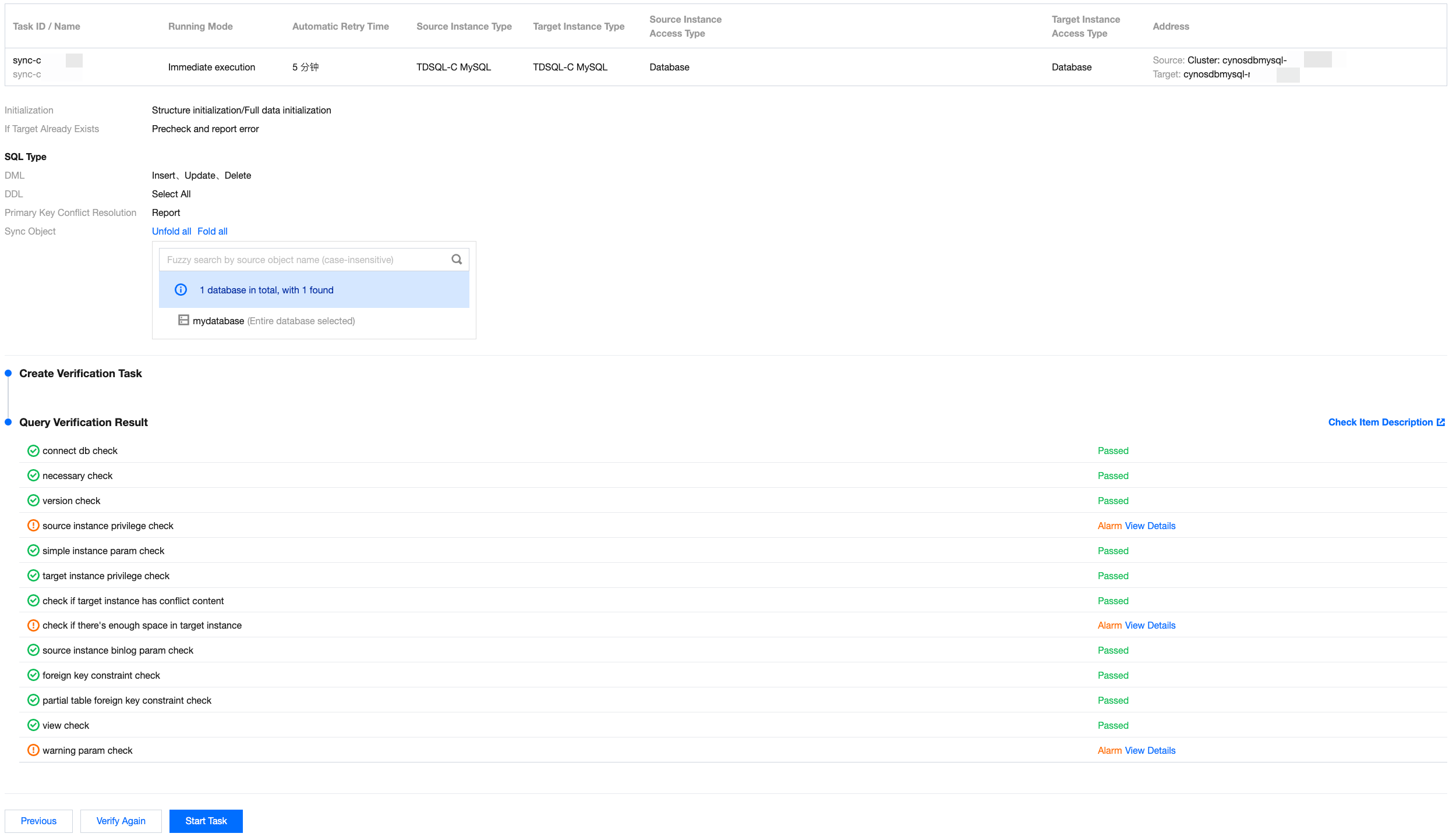 検証タスクが不合格となった場合、検証不合格の対処方法を参考に問題を修正した後、再度検証タスクを開始してください。 同期タスクはソースデータベースとターゲットデータベースのインスタンス負荷を増加させる可能性があります。業務の低ピーク時間帯に操作を実行してください。