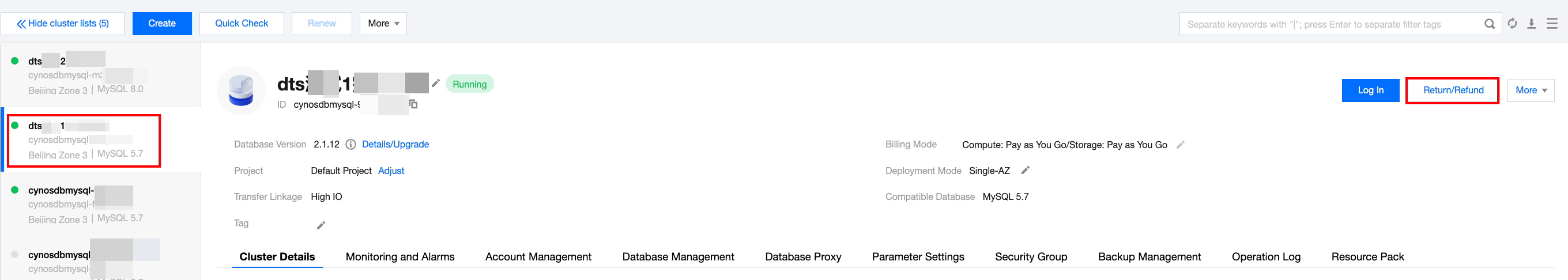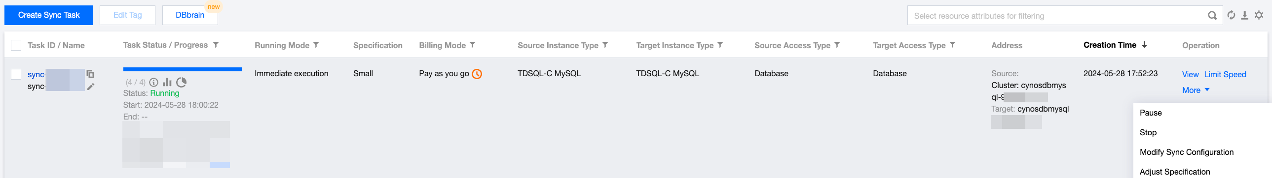 データ同期が完了し検証が一致した後、ソースクラスタが不要であることを確認したら、実際のアプリケーション側で業務接続を手動で新クラスタの接続アドレスに更新できます。その後、DTS側のデータ同期リストで該当データ同期タスクを終了し、最後にTDSQL-C for MySQLコンソールでソースクラスタを削除します。 同期タスクを終了する: