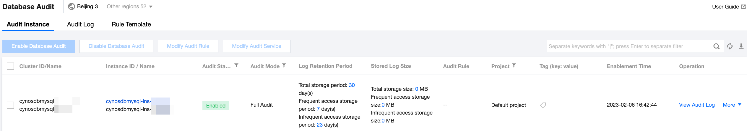 1.1 TDSQL-C for MySQLコンソールにログインし、左側のナビゲーションバーでデータベース監査ページを選択します。「監査ステータス」フィールドに有効と表示されている場合、現在のアカウントが指定リージョンのインスタンスでデータベース監査機能を有効にしていることを示します。 1.2 「監査ログを表示」をクリックすると、対応するインスタンスの監査ログページにジャンプします。監査ログの記録を確認できます(監査ログ記録が生成されている必要があります)。これにより、データベース監査が正常に動作していることを証明します。
