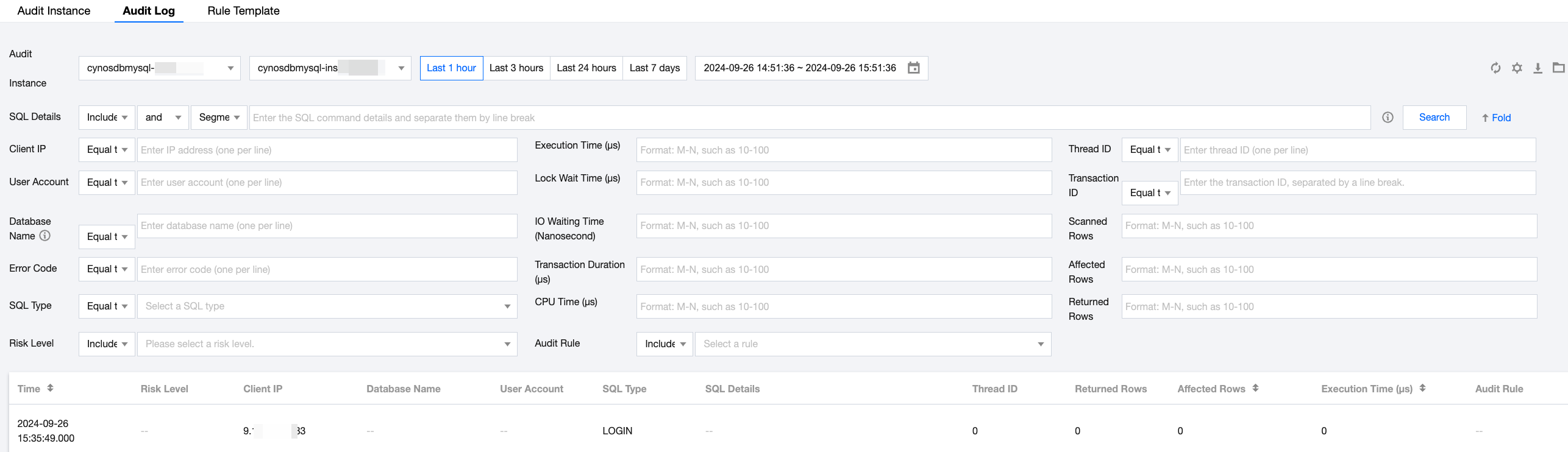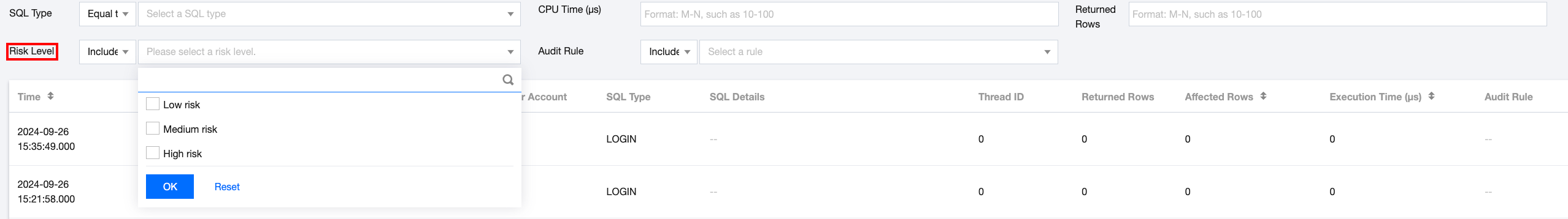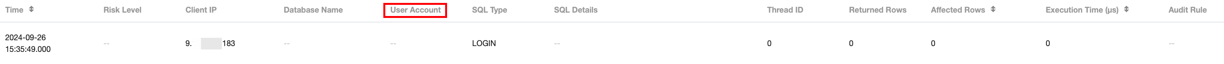 事後アラームの設定を行うことで、設定した監査ルールとリスクレベルアラームに基づき、ユーザーがリスクアラームをタイムリーに取得できるよう支援します。監査ログページでは、問題を迅速に特定し、関連する監査ログを確認できます。 b) 監査記録には、イベントの日付と時刻、ユーザーアカウント、SQLタイプ、SQLコマンドの詳細、および監査に関連するその他の情報を含める必要があります。