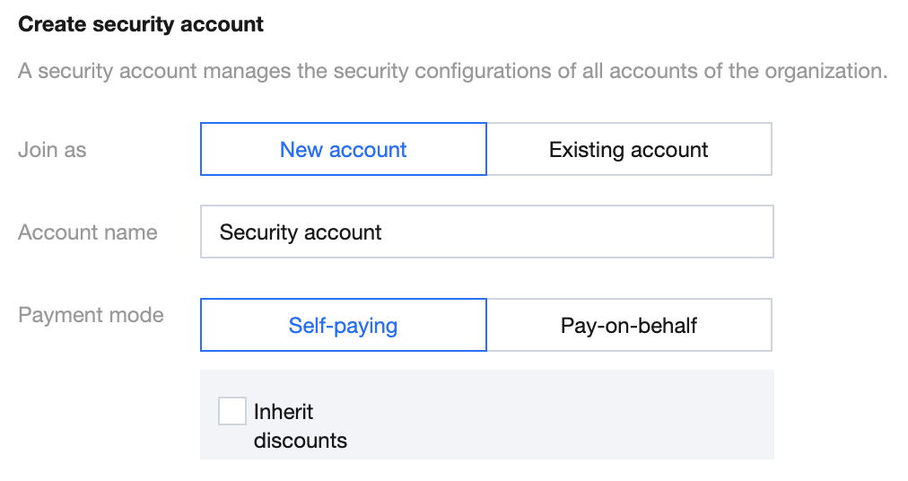 既存アカウントの選択をクリックすると、所属する部門構造に基づき、ドロップダウンボックスから既存のアカウントを選択してセキュリティ管理アカウントとすることができます。支払い方法は選択したアカウントの方式を引き継ぎます。