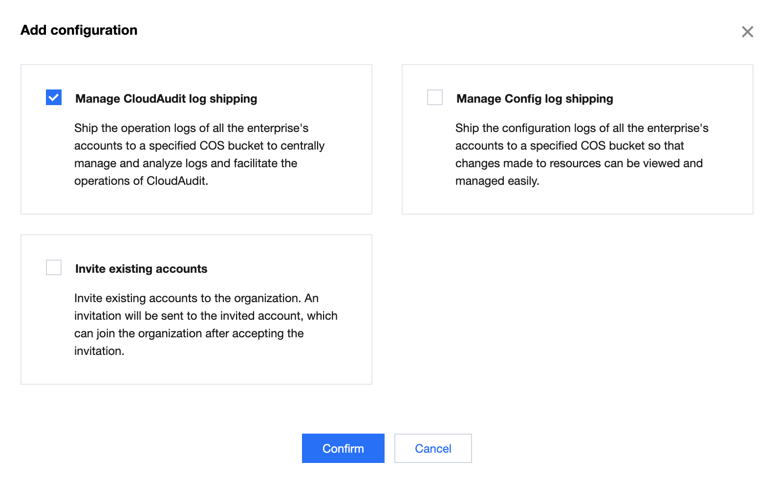 2. 設定項目の追加ポップアップウィンドウで、CloudAuditログ配信の管理にチェックを入れ、確定をクリックしてください。