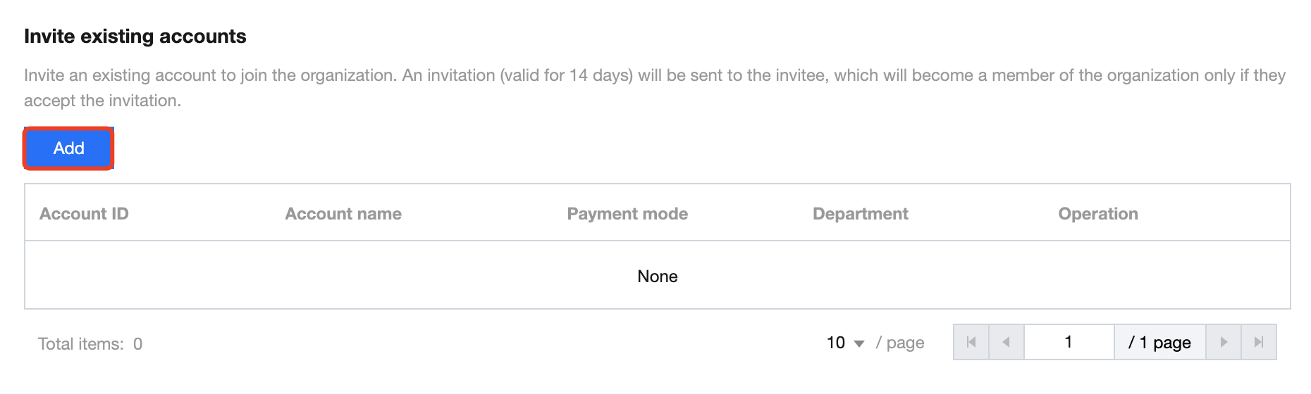 3. 既存アカウントの招待ページで、追加をクリックします。