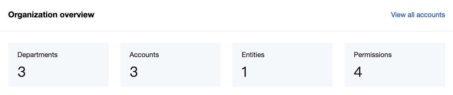 組織概要モジュールは、現在のアカウントが所属する組織の下に存在する部門数、アカウント数、主体数、およびアクセス権限数を表示します。これは表示のみです。具体的な操作については 組織とアカウントを表示を参照してください。