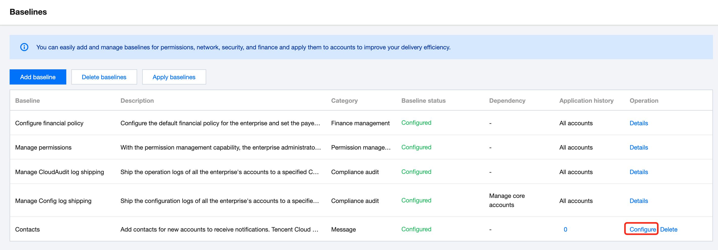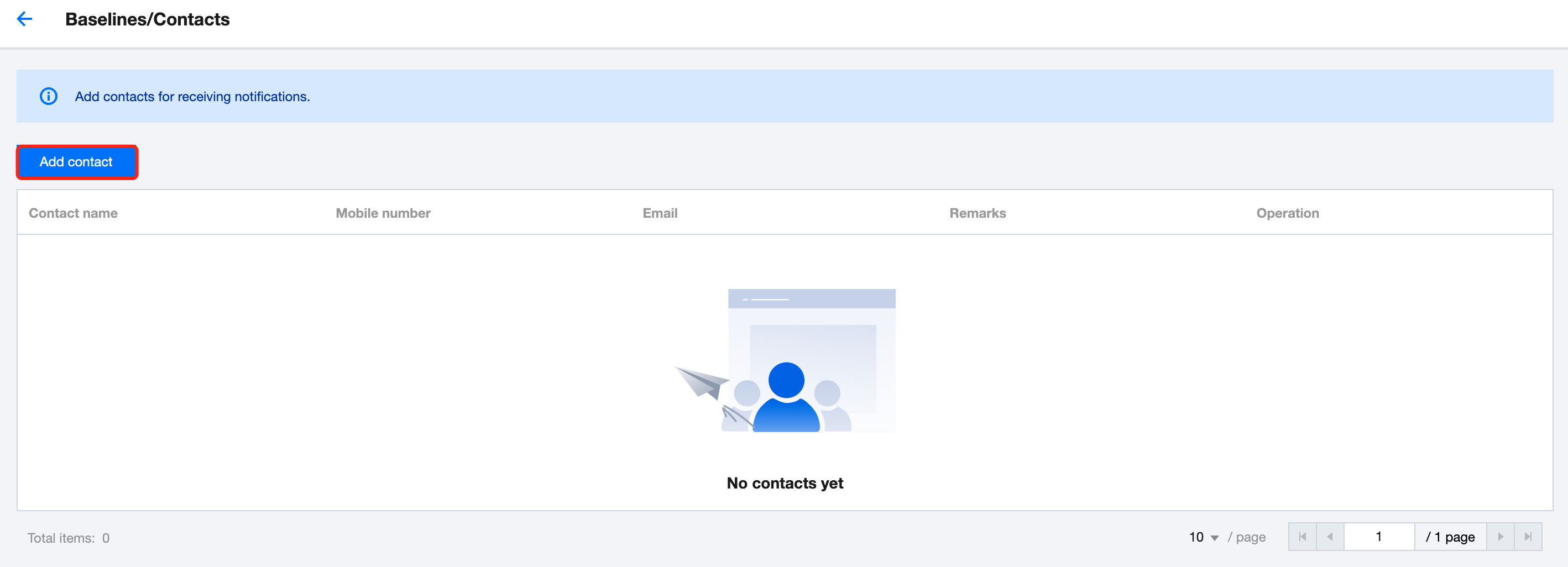 1. Control Center > ベースライン管理 ページで、連絡先ベースライン項目の設定をクリックします。 2. ベースライン管理/連絡先ベースライン項目ページで、連絡先の追加をクリックします。ポップアップウィンドウで、必要に応じて、アカウントのメッセージ通知を受信する連絡先の情報を入力します。