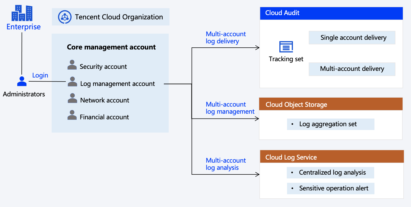 複数アカウント管理において、企業管理者はこのソリューションに従い、簡単な設定で複数アカウントの監査ログを継続的に収集できます。さらに、TCO、CloudAudit、Control Center、CLSなどのクラウド製品を組み合わせ、ログの生成、収集、保存、分析、アラートというプロセスを通じて、複数アカウントログ管理システムを構築します。