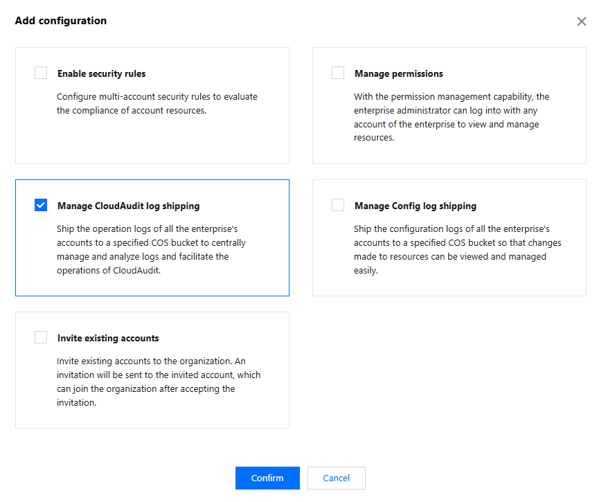 2. 設定項目の追加ポップアップウィンドウで、CloudAuditログ配信の管理にチェックを入れ、確定をクリックしてください。