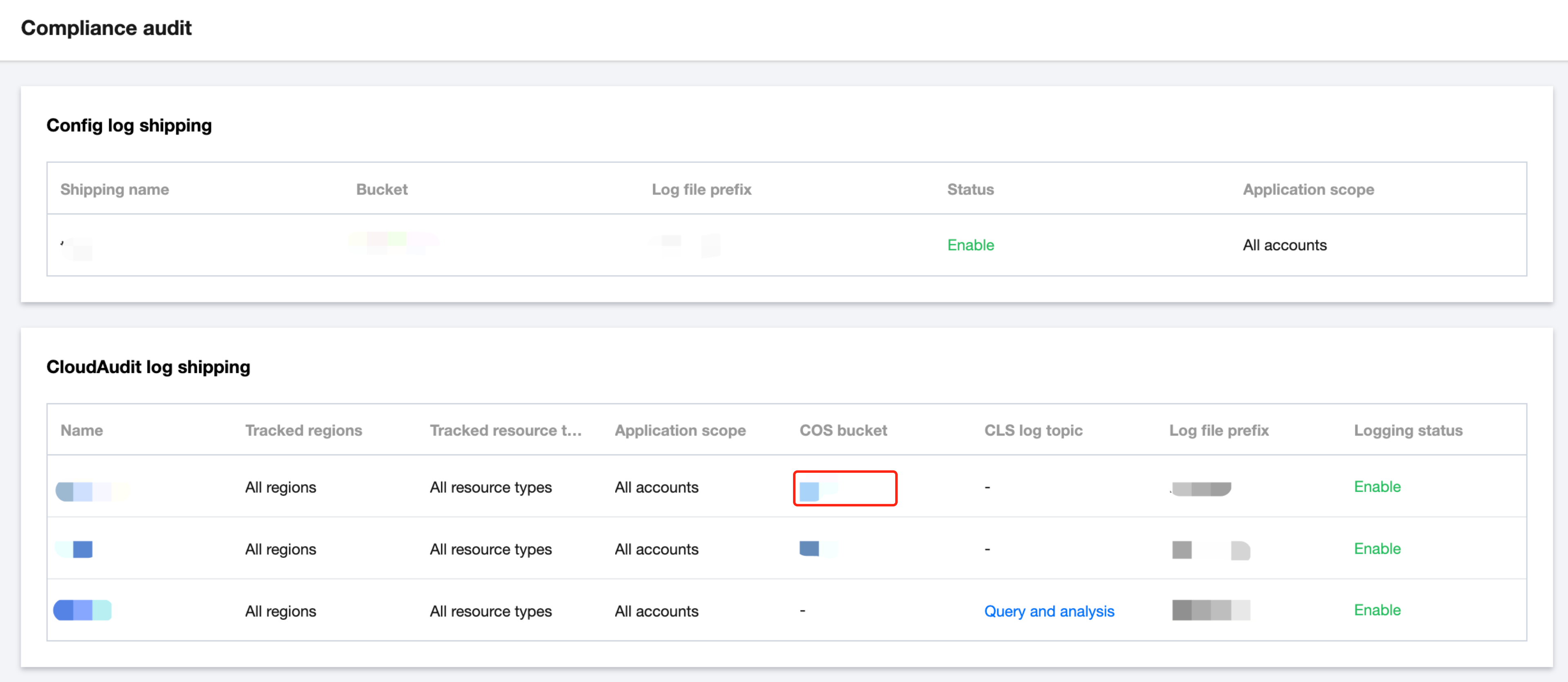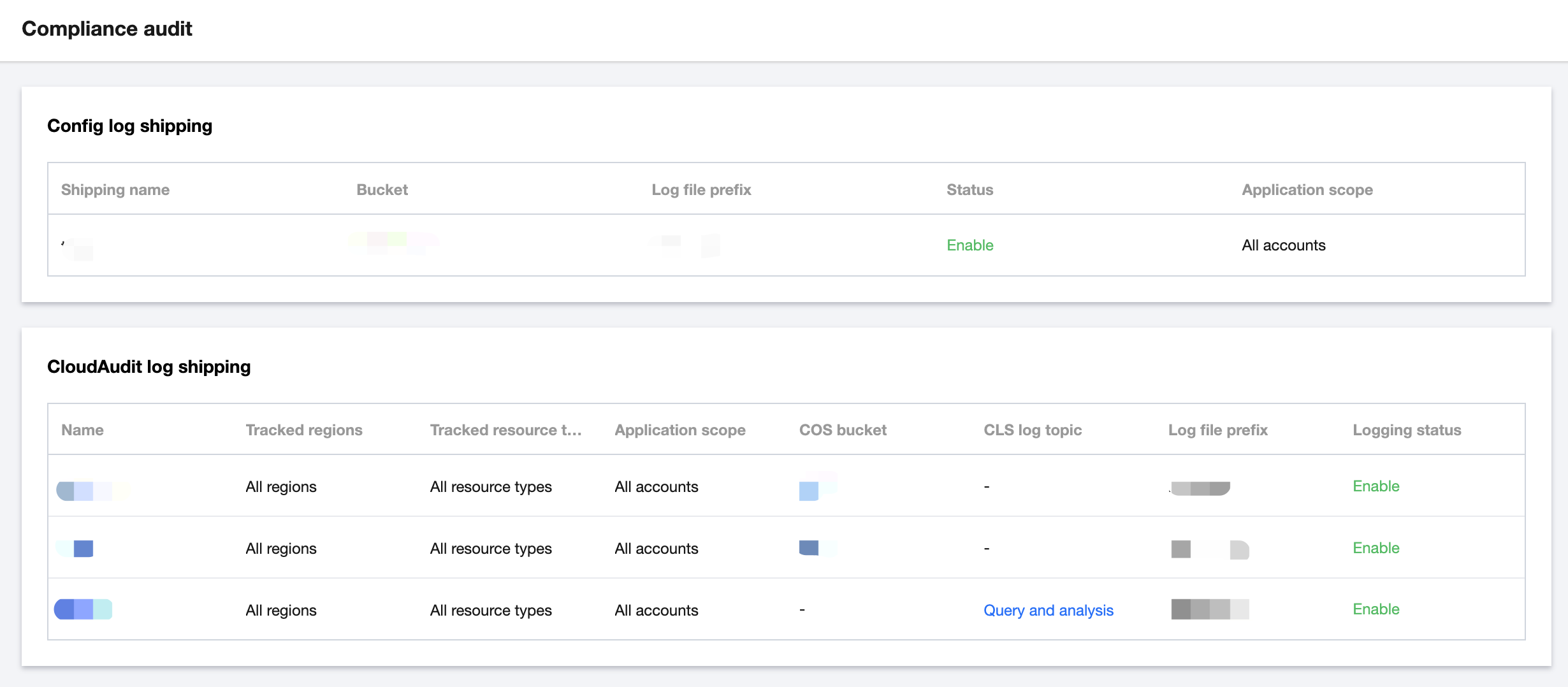 1. Tencent Cloudコンソールにログインし、Control Center > コンプライアンス監査ページに移動します。Configログ配信とCloudAuditログ配信のリストを通じて、2種類のログ配信の具体的な位置を明確に確認できます。 ログの参照と収集されたログの取得