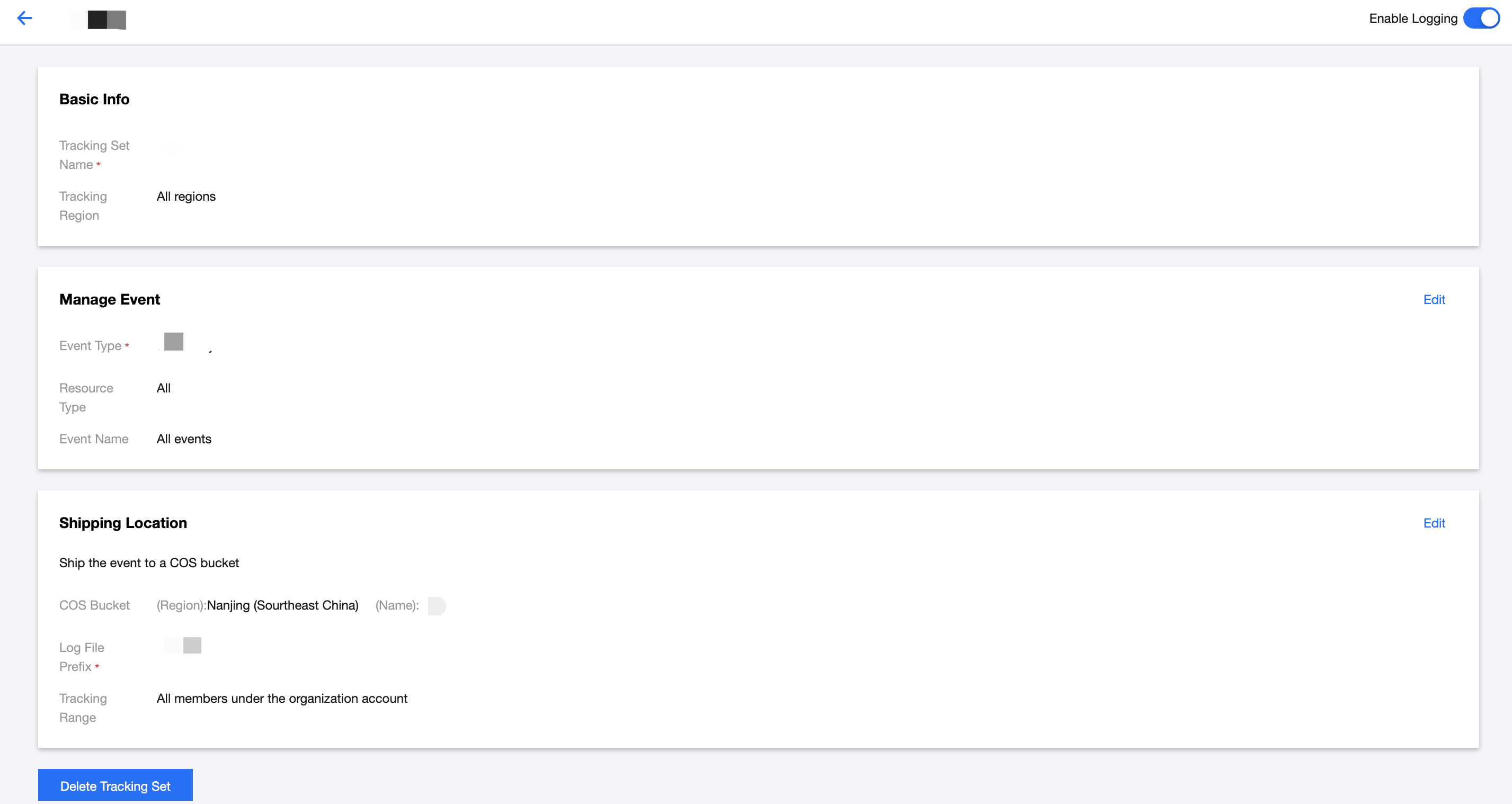 1. CloudAuditログ配信リスト内の配信名をクリックし、CloudAudit > トラッキングセットページを開きます。 2. CloudAudit > トラッキングセットページでは、トラッキングセットの表示、編集、削除操作が行えます。