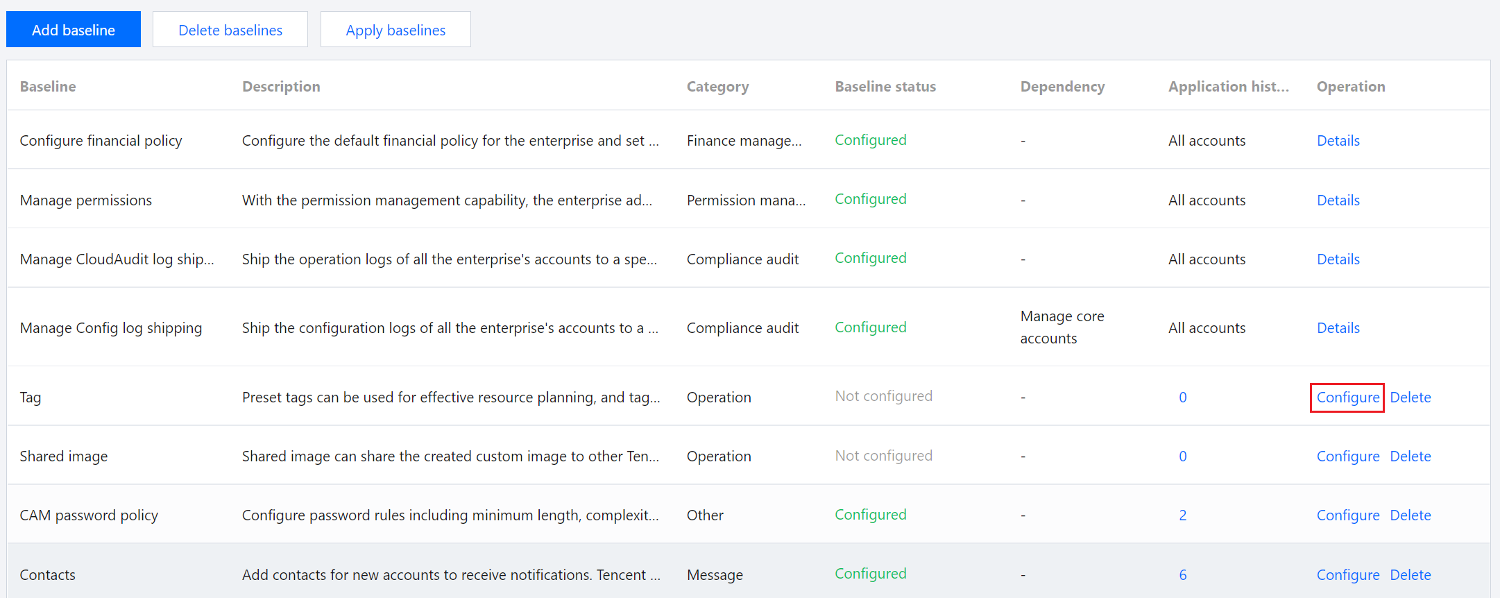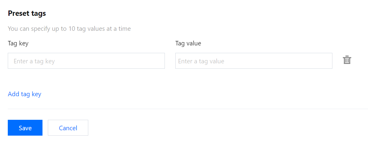 1. Control Center > ベースライン管理 ページで、プリセットTagベースライン項目の設定をクリックします。 2. ベースライン管理/プリセットTagページで、TagキーとTag値を入力し、Tag内容の登録を完了します。Tagキーの追加をクリックすると、複数のTagキーとTag値を追加でき、Tagポリシーは合計30以下のTag値となります。