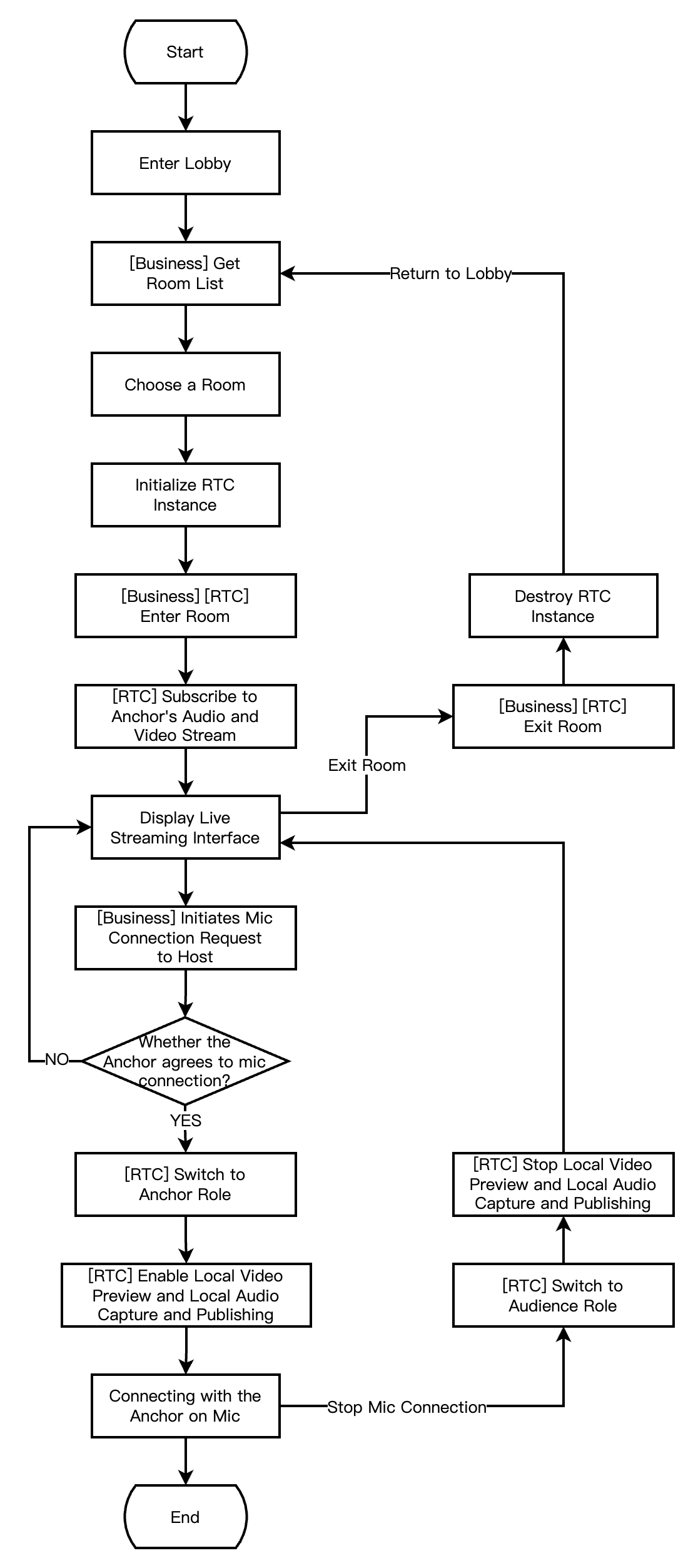 - (void)enterRoomByAnchorWithUserId:(NSString *)userId roomId:(NSString *)roomId {TRTCParams *params = [[TRTCParams alloc] init];// 文字列のルーム番号を例にparams.strRoomId = roomId;params.userId = userId;// 業務バックエンドから取得したUserSigparams.userSig = @"userSig";// 自分のSDKAppIDに置き換えるparams.sdkAppId = 0;// アンカーロール指定params.role = TRTCRoleAnchor;// インタラクティブライブシナリオで入室[self.trtcCloud enterRoom:params appScene:TRTCAppSceneLIVE];}// 入室結果イベントコールバック- (void)onEnterRoom:(NSInteger)result {if (result > 0) {// resultは入室にかかった時間(ミリ秒)NSLog(@"Enter room succeed!");} else {// result入室失敗のエラーコードNSLog(@"Enter room failed!");}}
