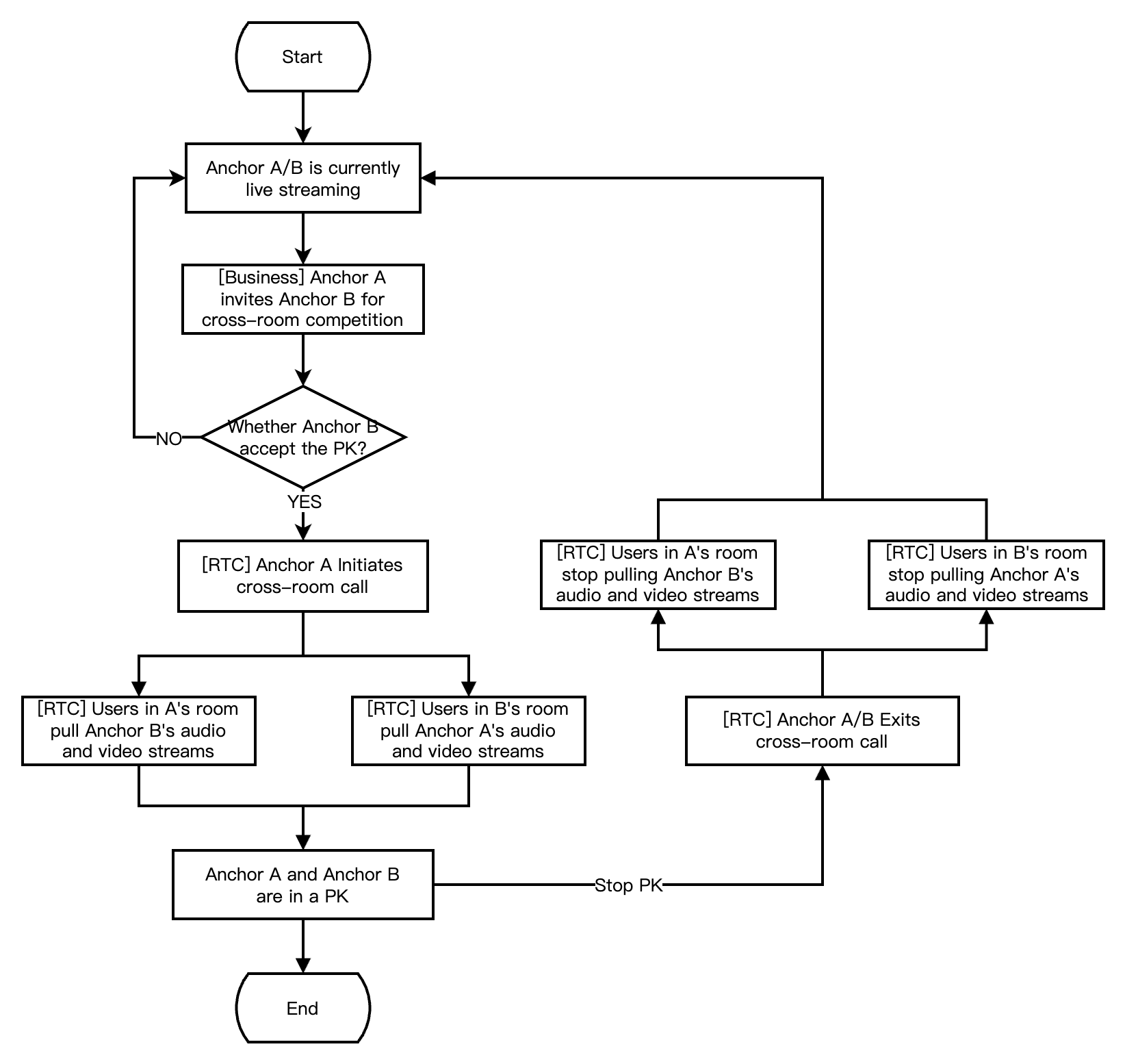public void connectOtherRoom(String roomId, String userId) {try {JSONObject jsonObj = new JSONObject();// 数字のルーム番号はroomIdです。jsonObj.put("strRoomId", roomId);jsonObj.put("userId", userId);mTRTCCloud.ConnectOtherRoom(jsonObj.toString());} catch (JSONException e) {e.printStackTrace();}}// クロスルームPKのレスポンスコールバック@Overridepublic void onConnectOtherRoom(String userId, int errCode, String errMsg) {// クロスルームアンカーと交流したいユーザーID// エラーコード、ERR_NULLはリクエスト成功// エラーメッセージ}