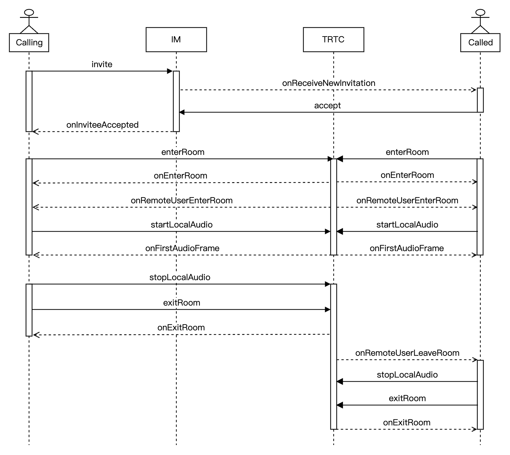 #pragma mark - TRTCCloudDelegate- (void)onRemoteUserLeaveRoom:(NSString *)userId reason:(NSInteger)reason {[self hangup];}- (void)onExitRoom:(NSInteger)reason {// 部屋から正常に退出し、通話を切断しましたself.isOnCalling = NO;}