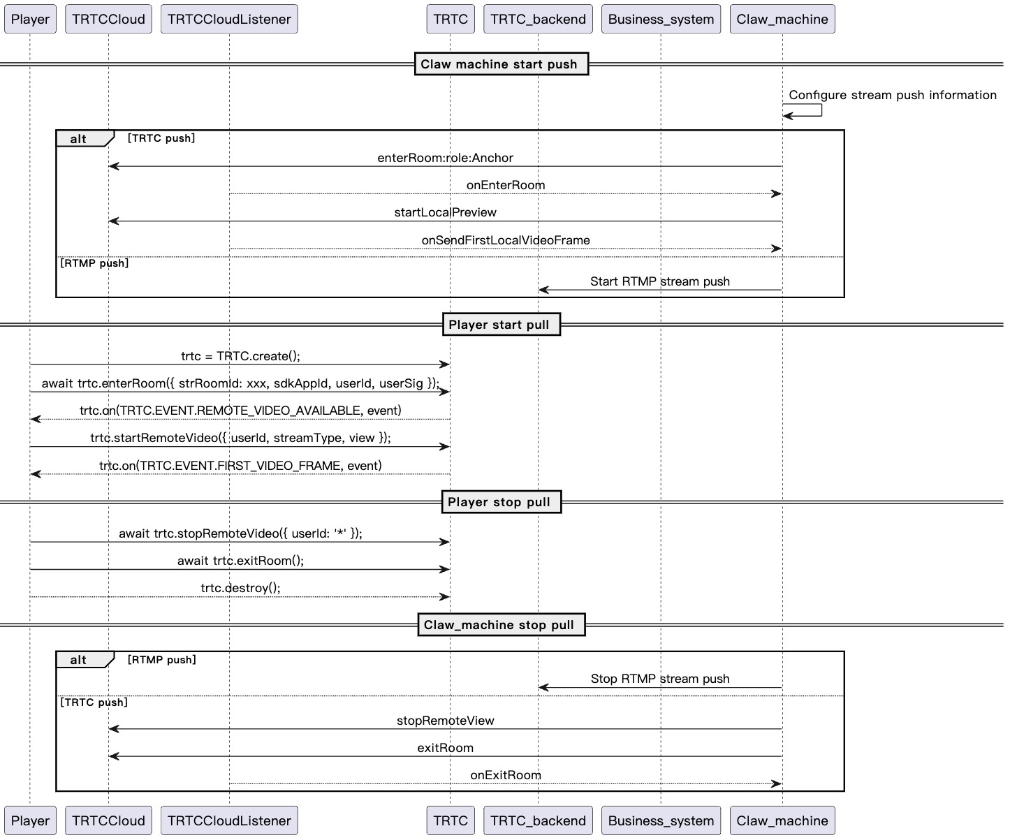 下図は、オンラインクレーンゲーム RTMP プッシュ型配信のシーケンス図を示しており、ネットワークカメラの RTMP プッシュ型配信やユーザープル型配信などのプロセスが含まれています。