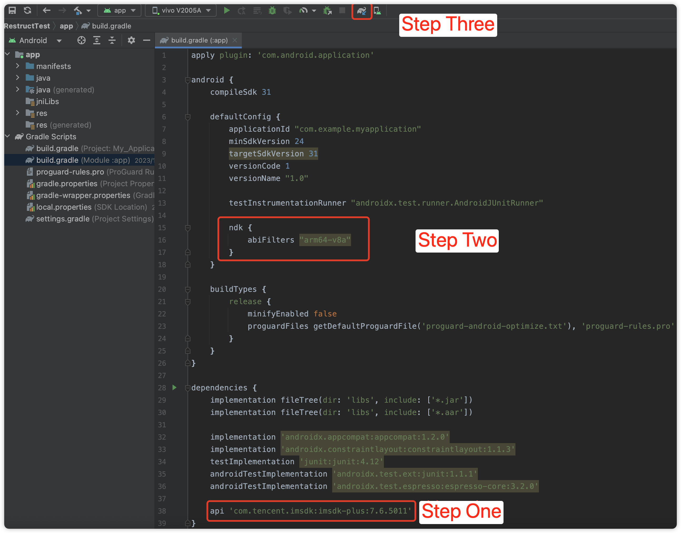 dependencies {// 完全版のIM SDKを統合する場合、バージョン番号は'8.1.6129'以上にする必要がありますapi 'com.tencent.imsdk:imsdk-plus:8.1.6129'// または、ボリュームを削減したIM SDK(AIシグナリング関連機能のみを含む)を統合する場合、バージョン番号は'8.2.6361'以上にする必要がありますapi 'com.tencent.imsdk:signalingsdk:8.2.6361'}