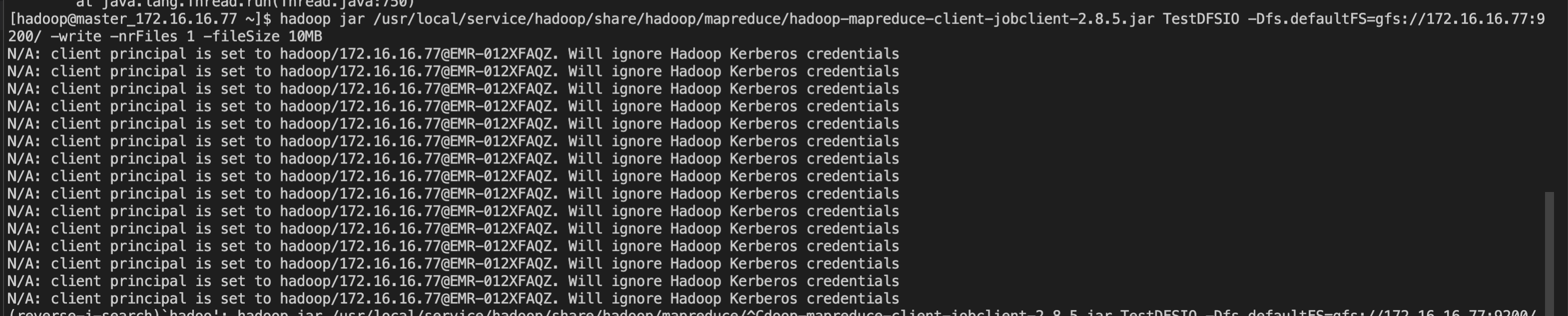 hadoop jar /usr/local/service/hadoop/share/hadoop/mapreduce/hadoop-mapreduce-client-jobclient-2.8.5.jar TestDFSIO -Dfs.defaultFS=gfs://172.16.16.77:9200/ -write -nrFiles 1 -fileSize 10MB