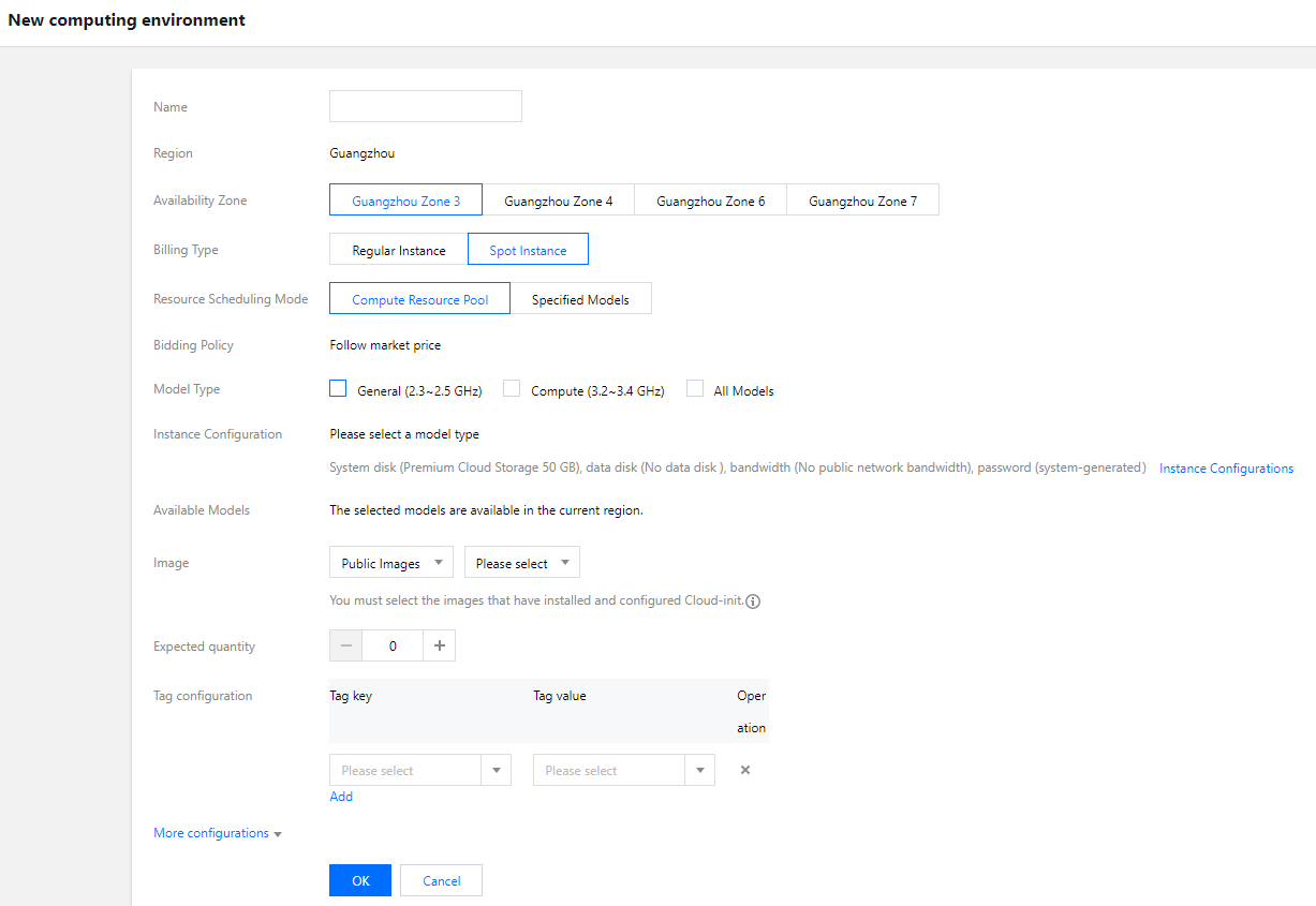 3. 컴퓨팅 환경 생성 페이지에서 ‘과금 유형’을 스팟 인스턴스로 설정하고 실제 수요에 따라 모델, 이미지, 이름 및 기대 수량 등 정보를 선택합니다. 아래 이미지와 같습니다.