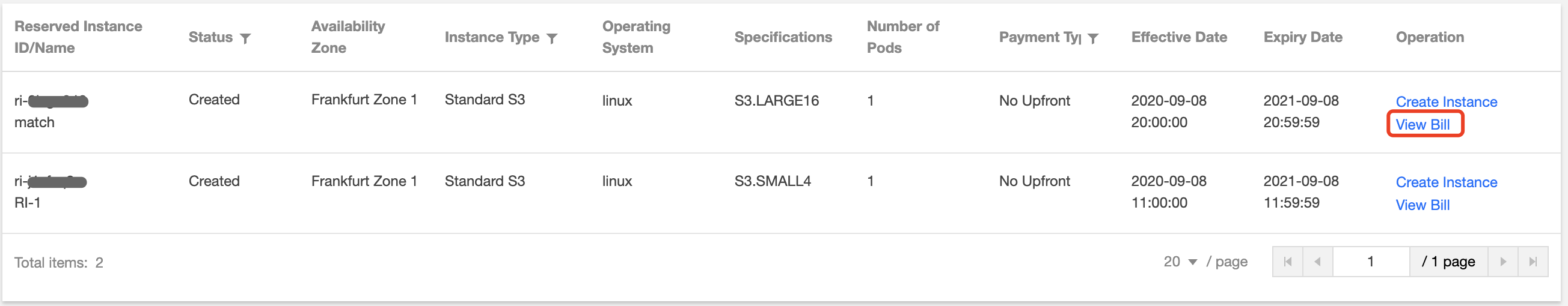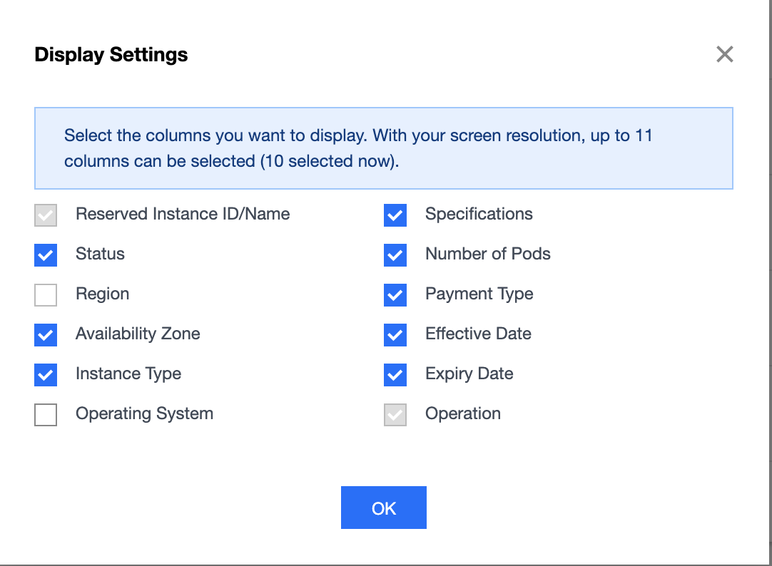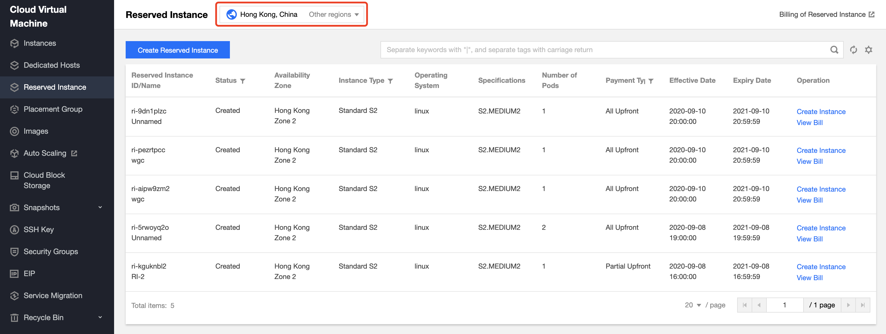 리전 선택 창에서 조회할 예약 인스턴스 과금 리전을 선택합니다. 해당 페이지에서 ID/예약 인스턴스 과금 이름, 상태, 리전, 가용존, 인스턴스 유형, 사양, 운영 체제, 예약 인스턴스 과금 수량, 결제 유형, 적용 일자, 만료 일자 등의 정보를 확인할 수 있습니다. 예약 인스턴스 속성은