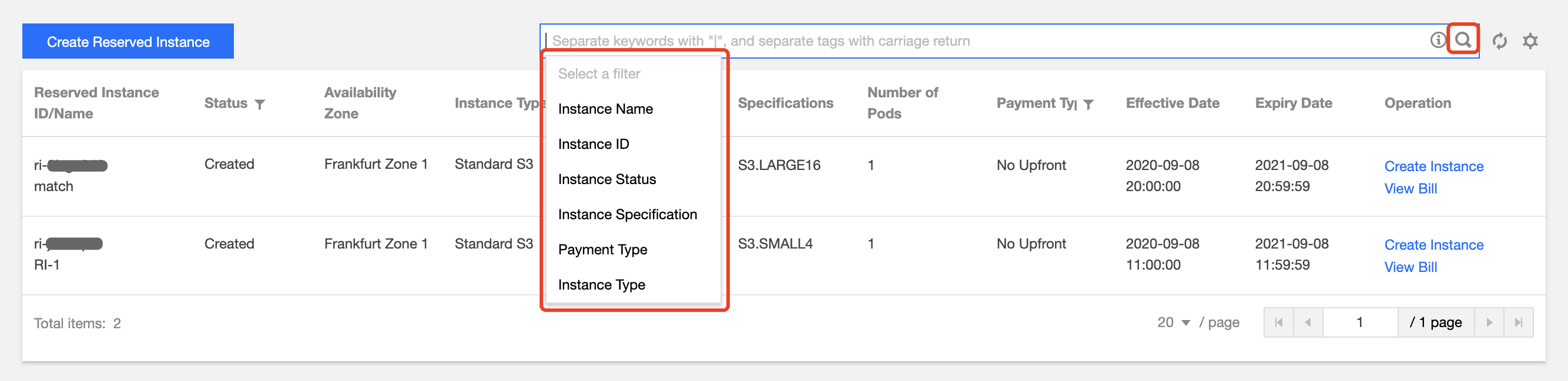 예약 인스턴스 검색 기능 현재는 ID, 예약 인스턴스 이름, 상태, 인스턴스 유형, 사양, 결제 유형 등으로 예약 인스턴스를 검색할 수 있습니다. 아래 이미지와 같이 실제 수요에 따라 검색창에 검색 내용을 입력하고