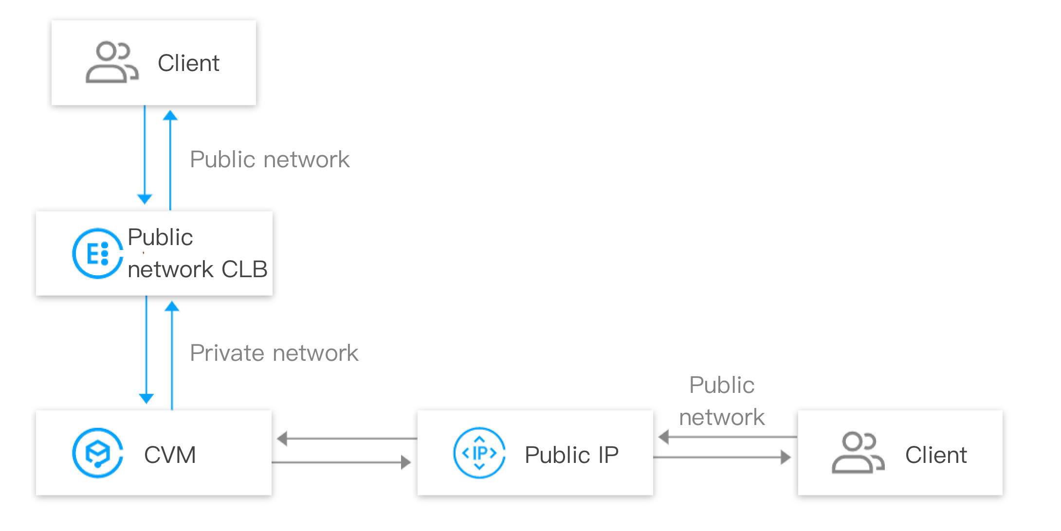CVM 인스턴스가 공중망에 액세스하거나 공중망 IP를 통해 액세스하면 CVM 인스턴스는 공중망 IP 또는 EIP를 통해 클라이언트와 인터랙션합니다.
