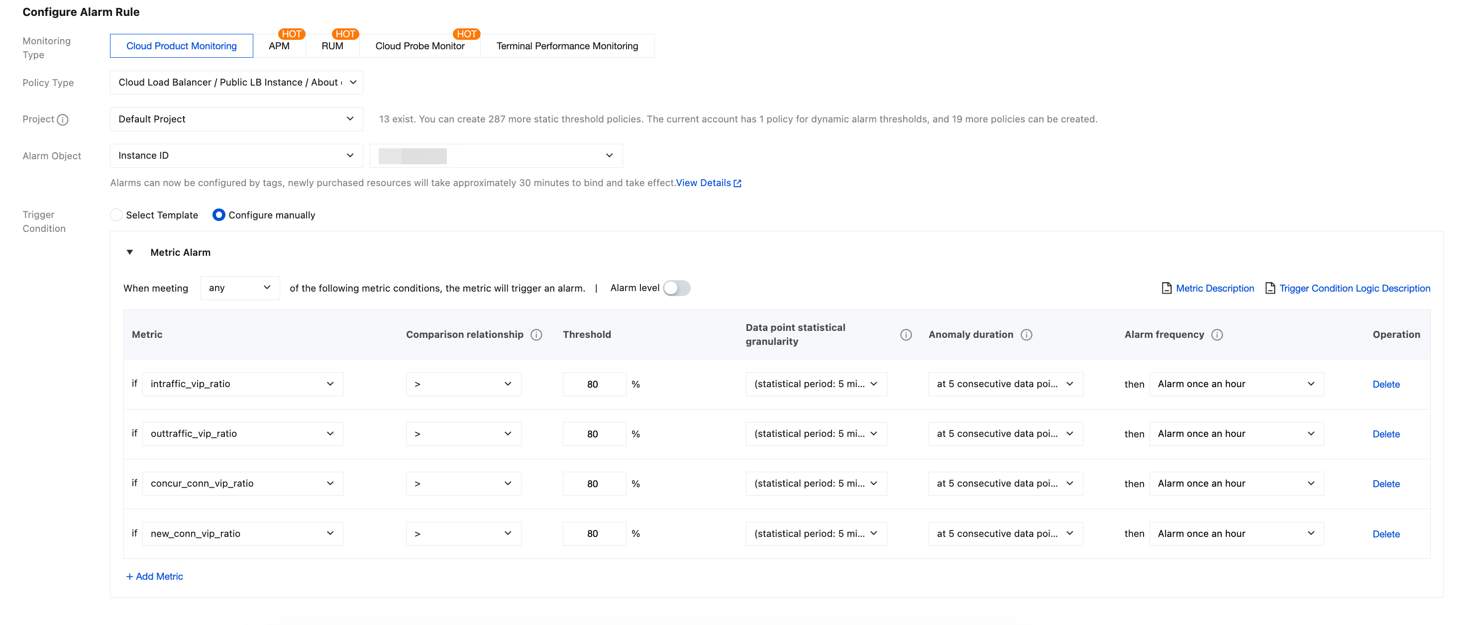 예를 들어 알람 지표는 인바운드 대역폭 사용률로, 비교 관계가 >로, 임계값이 80% 로, 연속 모니터링 데이터 포인트가 5개로, 알람 빈도가 1 시간 당 1회입니다. 즉, 로드 밸런싱 인스턴스의 인바운드 대역폭 사용률이 5회 연속 80%를 초과하는 경우 알람이 트리거됩니다. 알람 빈도는 1 시간 당 1회입니다.