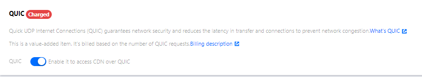 QUIC 액세스는 부가 가치 서비스로, QUIC 요청 건수는 종량제 후불제로 과금됩니다. 자세한 내용은 과금 설명을 참고하십시오.