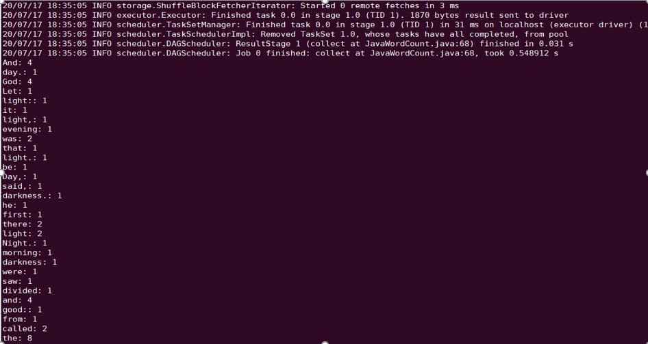 spark-submit --class org.apache.spark.examples.JavaWordCount --executor-memory 4g --executor-cores 4 ./spark-examples-1.6.0-cdh5.16.1-hadoop2.6.0-cdh5.16.1.jar ofs://examplebucket-1250000000/wordcount