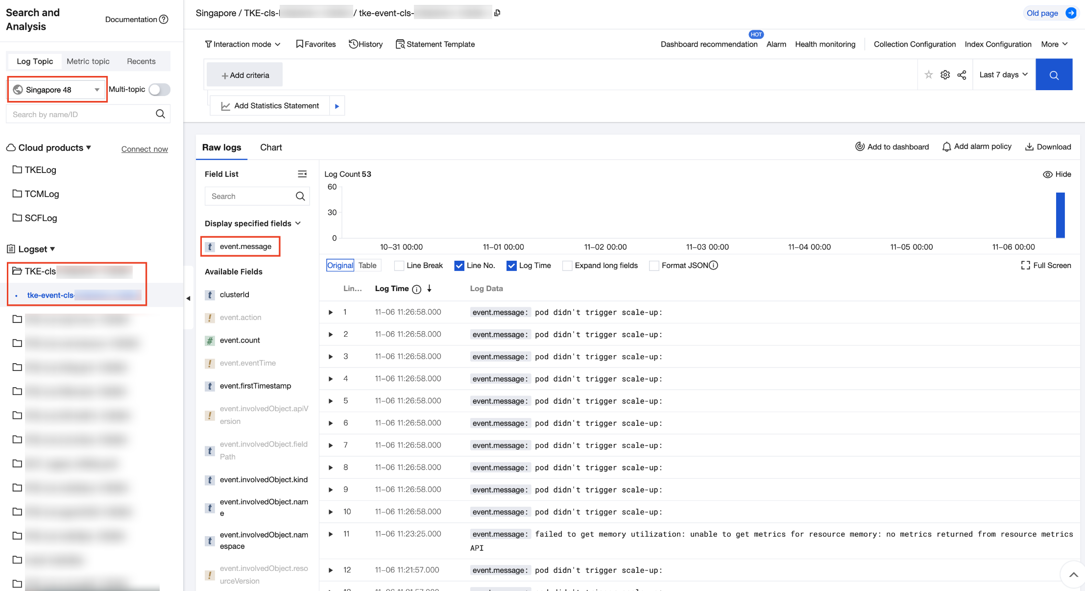 1. Log in to the CLS console and go to the Search and Analysis page. 2. On the Search and Analysis page, select the region, and the logset and logtopic of the cluster with event collection enabled.