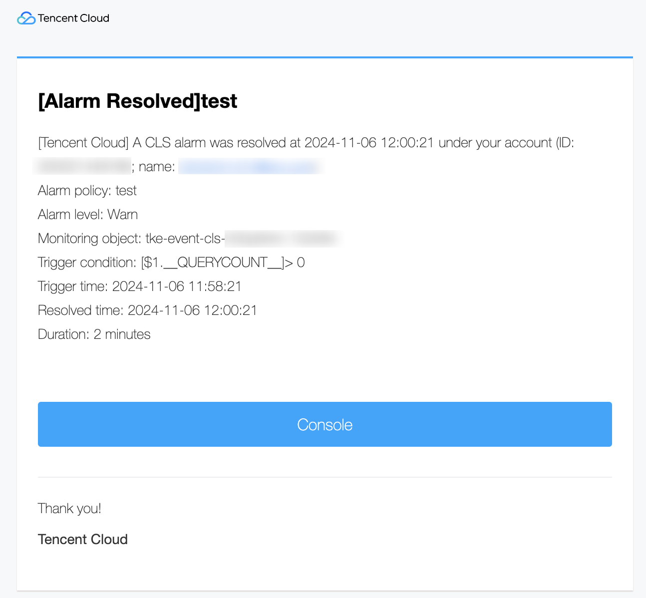 You need to ensure that new events have occurred in Step 2, and that the execution cycle and alarm notification frequency of the alarm policy in Step 2 are appropriate (for example, set it to once every minute during testing), so that you can view the alarm content in the alarm notification channel. In this example, alarms are set to be sent by emails, and you can refer to the alarm content in the email, as shown in the figure below.