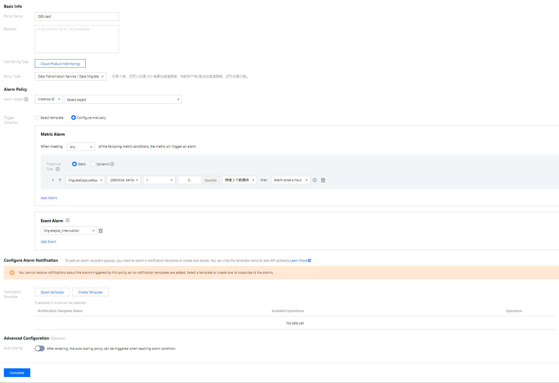 | 수동 설정(이벤트 알람) | 모니터링할 이벤트를 선택합니다. ‘데이터 마이그레이션 작업 중단’ 이벤트는 기본적으로 시스템에 이미 설정되어 있습니다. |