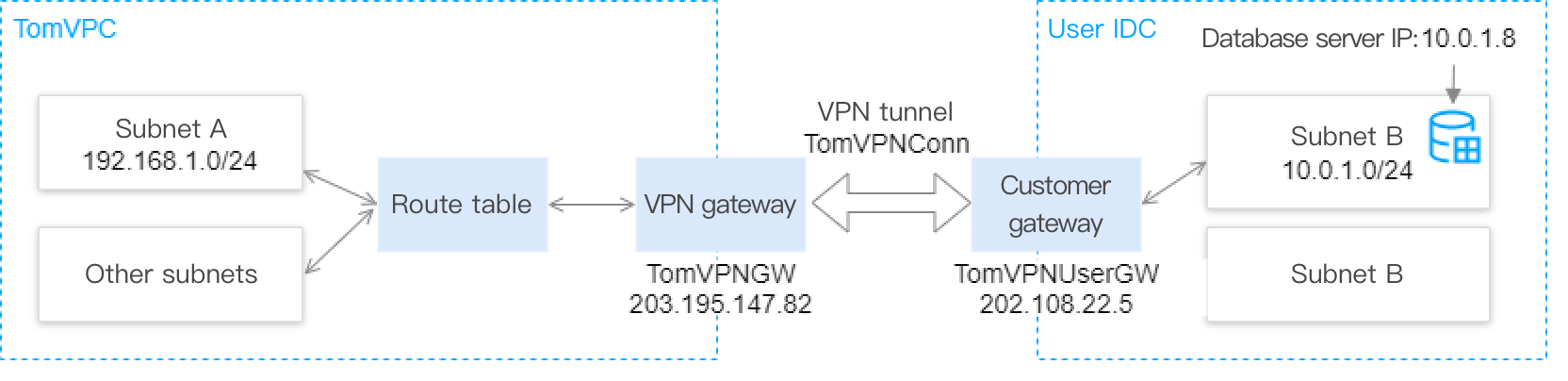 192.168.1.0/24입니다. 생성된 VPN 게이트웨이는 ‘TomVPNGW’, VPN 게이트웨이의 공용 IP는 203.195.147.82, IDC의 서브넷 IP 대역는 10.0.1.0/24, IDC에 있는 VPN 게이트웨이의 공용 IP는 202.108.22.5, 원본 데이터베이스 서버의 IP 주소는 10.0.1.8입니다.