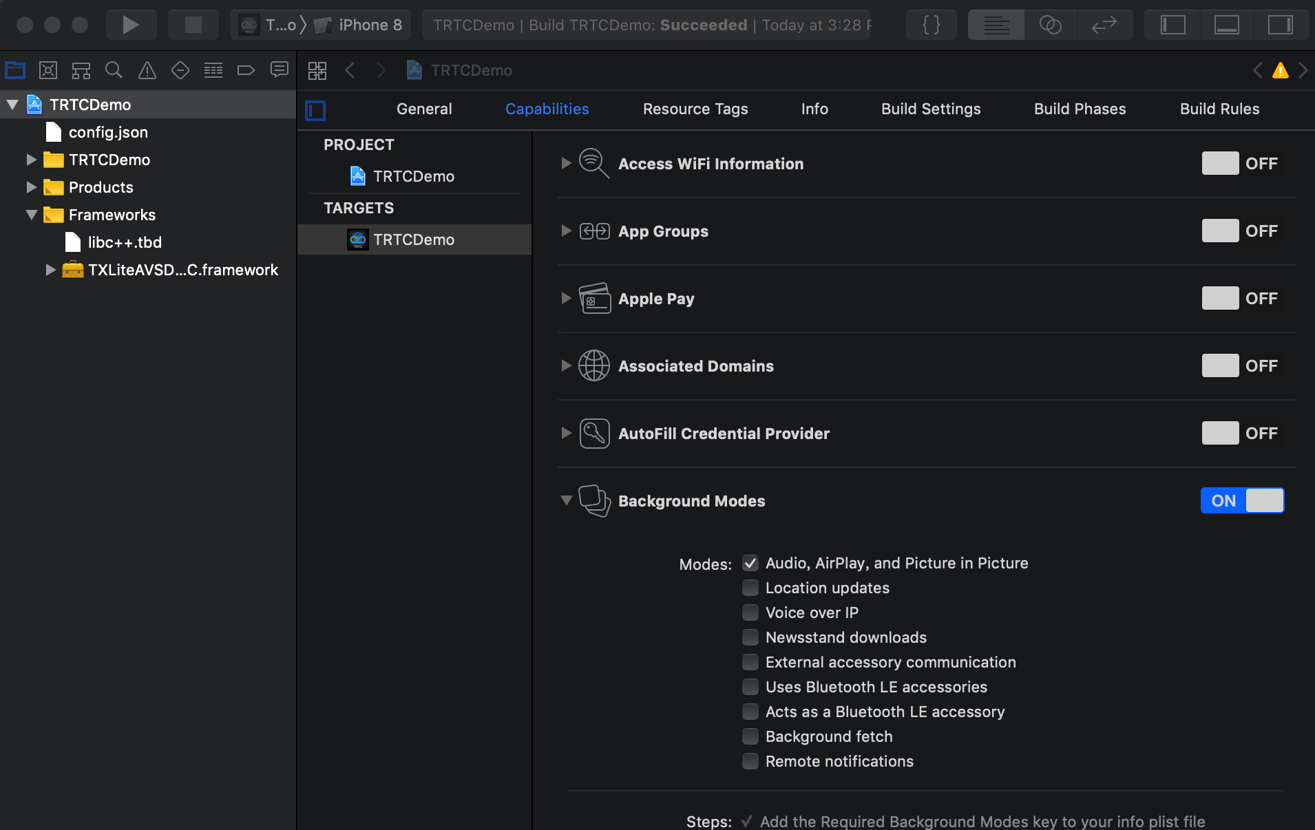 지원합니다. 현재 프로젝트를 선택한 후 Capabilities에서 Background Modes를 ON으로 설정하고, Audio, AirPlay and Picture in Picture를 선택하면 백그라운드에서 실행할 수 있습니다. 자세한 내용은 다음 이미지를 참고하십시오.