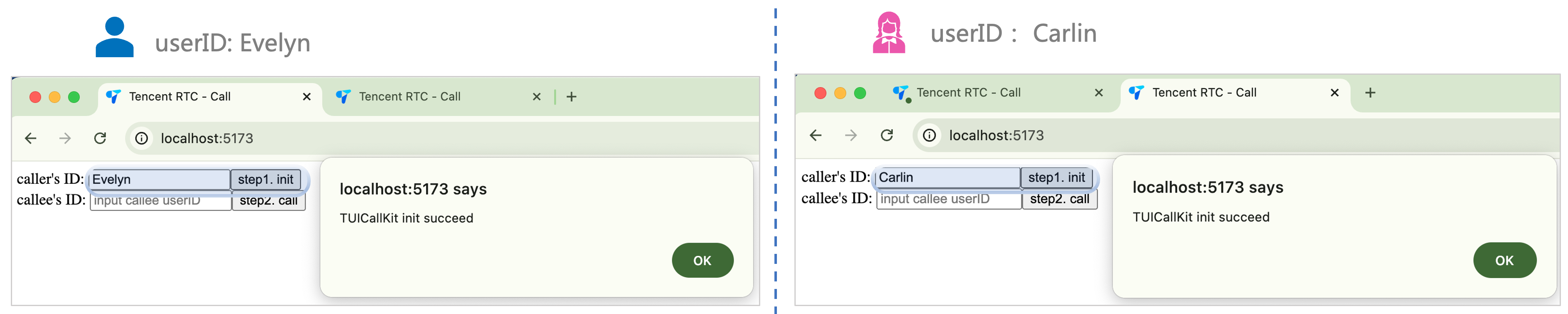 SDKAppID、SDKSecretKey의 2개 매개변수를 기입해야 합니다.<script setup>import { ref } from 'vue';import { TUICallKit, TUICallKitServer, TUICallType } from "@tencentcloud/call-uikit-vue";import \\* as GenerateTestUserSig from "./debug/GenerateTestUserSig-es"; // Refer to Step 3const SDKAppID = 0; // TODO: Replace with your SDKAppID (Notice: SDKAppID is of type number)const SDKSecretKey = ''; // TODO: Replace with your SDKSecretKeyconst callerUserID = ref('');const calleeUserID = ref('');//【2】Initialize the TUICallKit componentconst init = async () => {const { userSig } = GenerateTestUserSig.genTestUserSig({userID: callerUserID.value,SDKAppID,SecretKey: SDKSecretKey});await TUICallKitServer.init({userID: callerUserID.value,userSig,SDKAppID,});alert('TUICallKit init succeed');}</script>