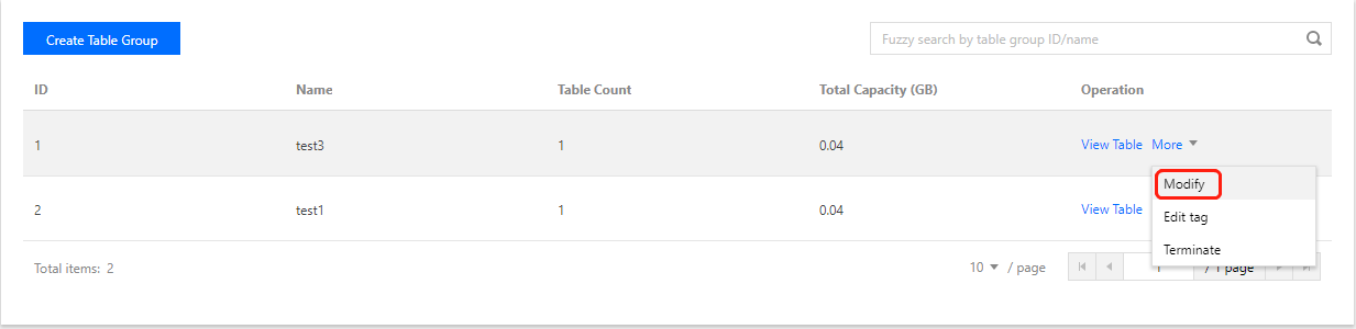 1. Acesse a página Lista de grupos de tabelas e clique em Modify (Modificar) na coluna "Operation (Operação)".
