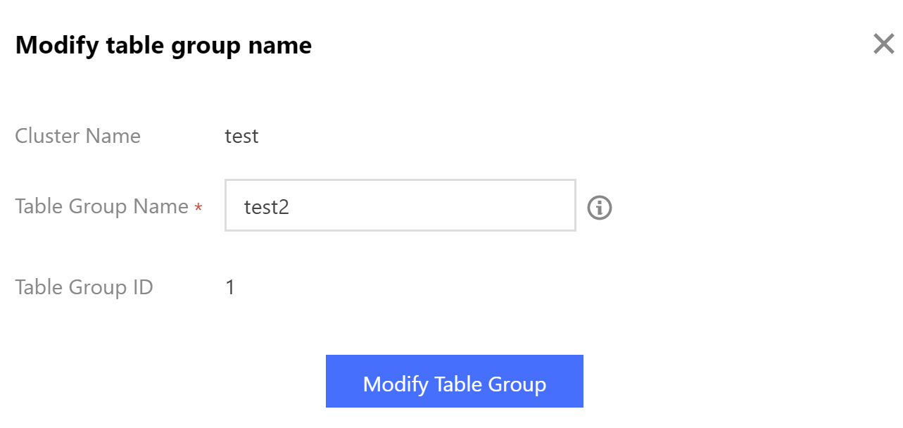 2. Na caixa de diálogo pop-up, clique em Modify Table Group (Modificar grupo de tabelas) para renomear o grupo de tabelas. O nome do grupo de tabelas deve ser exclusivo no cluster.