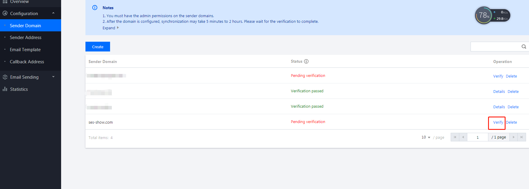 4. Clique no endereço do domínio de remetente para acessar a página de detalhes da configuração, onde você pode conferir o valor do domínio.