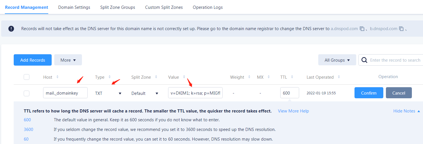 5. Cole o endereço do domínio de remetente na etapa 3 na página DNSPod para adicionar um registro. Evite espaços. _dmarc record:
