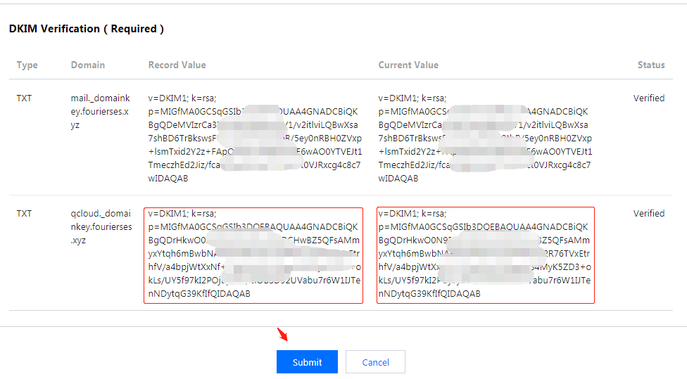 ocê precisa substituir o exemplo pelo seu endereço de remetente.6. Retorne à página de detalhes da configuração do Domínio de remetente e clique em Submit (Enviar).