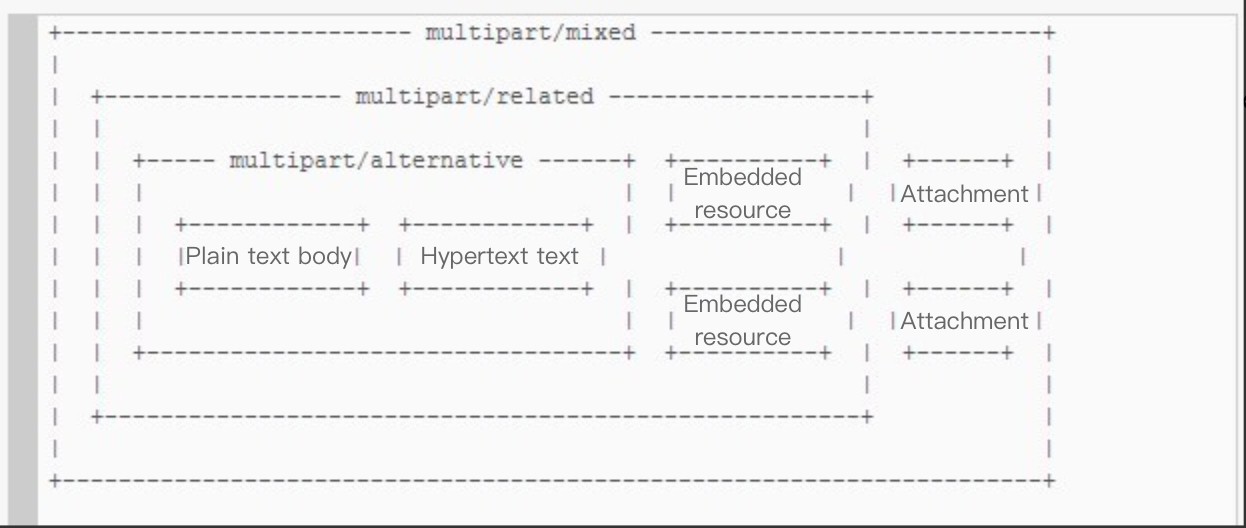 multipart/mixed. Se houver recursos incorporados, você deve definir pelo menos a parte multipart/related; se texto simples e hipertexto coexistem, você deve definir pelo menos a parte multipart/alternative.package mainimport ("bytes""crypto/tls""encoding/base64""fmt""io/ioutil""log""mime""net""net/smtp""time")// Test465Attachment para a porta 465func Test465Attachment() error {boundary := "GoBoundary"host := "sg-smtp.qcloudmail.com"port := 465email := "abc@cd.com"password := "***"toEmail := "test@test123.com"header := make(map[string]string)header["From"] = "test " + "<" + email + ">"header["To"] = toEmailheader["Subject"] = "Test465Attachment"header["Content-Type"] = "multipart/mixed;boundary=" + boundary// Este campo não é usado por enquanto. Passe `1.0` por padrãoheader["Mime-Version"] = "1.0"// Este campo não é usado por enquantoheader["Date"] = time.Now().String()bodyHtml := "<!DOCTYPE html>\\n<html>\\n<head>\\n<meta charset=\\"utf-8\\">\\n<title>hello world</title>\\n</head>\\n<body>\\n " +"<h1>My first heading</h1>\\n <p>My first paragraph.</p>\\n</body>\\n</html>"message := ""for k, v := range header {message += fmt.Sprintf("%s: %s\\r\\n", k, v)}buffer := bytes.NewBuffer(nil)buffer.WriteString(message)contentType := "Content-Type: text/html" + "; charset=UTF-8"body := "\\r\\n--" + boundary + "\\r\\n"body += contentType + "\\r\\n"body += "Content-Transfer-Encoding: base64\\r\\n"body += "\\r\\n" + base64.StdEncoding.EncodeToString([]byte(bodyHtml)) + "\\r\\n"buffer.WriteString(body)attachment := "\\r\\n--" + boundary + "\\r\\n"attachment += "Content-Transfer-Encoding:base64\\r\\n"attachment += "Content-Disposition:attachment\\r\\n"attachment += "Content-Type:" + "application/octet-stream" + ";name=\\"" + mime.BEncoding.Encode("UTF-8","./go.mod") + "\\"\\r\\n"buffer.WriteString(attachment)writeFile(buffer, "./go.mod")// É possível unir vários anexos no final. Pode haver no máximo dez anexos, cada um dos quais não pode exceder 5 MB de tamanho. O tamanho TOTAL de todos os anexos não pode exceder 8–9 MB; caso contrário, será retornado EOFattachment1 := "\\r\\n--" + boundary + "\\r\\n"attachment1 += "Content-Transfer-Encoding:base64\\r\\n"attachment1 += "Content-Disposition:attachment\\r\\n"attachment1 += "Content-Type:" + "application/octet-stream" + ";name=\\"" + mime.BEncoding.Encode("UTF-8","./bbbb.txt") + "\\"\\r\\n"buffer.WriteString(attachment1)writeFile(buffer, "./bbbb.txt")defer func() {if err := recover(); err != nil {log.Fatalln(err)}}()buffer.WriteString("\\r\\n--" + boundary + "--")message += "\\r\\n" + bodyauth := smtp.PlainAuth("",email,password,host,)err := SendMailWithTLS(fmt.Sprintf("%s:%d", host, port),auth,email,[]string{toEmail},buffer.Bytes(),)if err != nil {fmt.Println("Send email error:", err)} else {fmt.Println("Send mail success!")}return err}// Dial retorna um cliente smtpfunc Dial(addr string) (*smtp.Client, error) {conn, err := tls.Dial("tcp", addr, nil)if err != nil {log.Println("tls.Dial Error:", err)return nil, err}host, _, _ := net.SplitHostPort(addr)return smtp.NewClient(conn, host)}// SendMailWithTLS envia e-mail com tlsfunc SendMailWithTLS(addr string, auth smtp.Auth, from string,to []string, msg []byte) (err error) {//cria cliente smtpc, err := Dial(addr)if err != nil {log.Println("Create smtp client error:", err)return err}defer c.Close()if auth != nil {if ok, _ := c.Extension("AUTH"); ok {if err = c.Auth(auth); err != nil {log.Println("Error during AUTH", err)return err}}}if err = c.Mail(from); err != nil {return err}for _, addr := range to {if err = c.Rcpt(addr); err != nil {return err}}w, err := c.Data()if err != nil {return err}_, err = w.Write(msg)if err != nil {return err}err = w.Close()if err != nil {return err}return c.Quit()}// writeFile lê o arquivo para bufferfunc writeFile(buffer *bytes.Buffer, fileName string) {file, err := ioutil.ReadFile(fileName)if err != nil {panic(err.Error())}payload := make([]byte, base64.StdEncoding.EncodedLen(len(file)))base64.StdEncoding.Encode(payload, file)buffer.WriteString("\\r\\n")for index, line := 0, len(payload); index < line; index++ {buffer.WriteByte(payload[index])if (index+1)%76 == 0 {buffer.WriteString("\\r\\n")}}}func main() {Test465Attachment()}