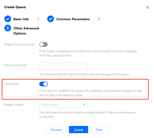 When creating a queue, select whether to enable Lazy Mode in Other Advanced Options. For specific steps, see Creating a Queue.