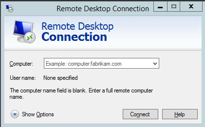 1. No computador Windows local, clique em e digite mstsc em Search programs and files (Pesquisar programas e arquivos) e pressione Enter para abrir a caixa de diálogo de conexão da área de trabalho remota, conforme mostrado abaixo: