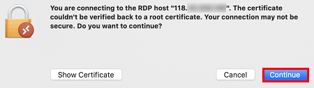 Se você usar uma senha padrão do sistema para fazer login na instância, poderá obter a senha no Centro de mensagens. 5. Na janela pop-up, clique em Continue (Continuar) para estabelecer a conexão, conforme mostrado abaixo: