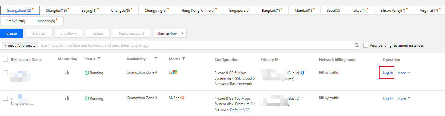 2. Na página Instances (Instâncias), localize o CVM do Windows no qual deseja fazer login e clique em Log In (Login) conforme mostrado abaixo.