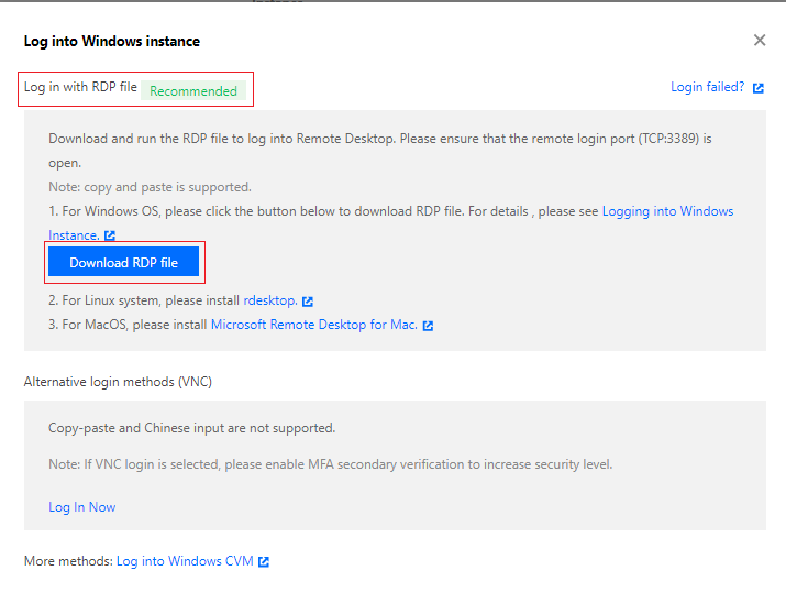 O Remote Desktop Protocol (RDP) é um protocolo de vários canais desenvolvido pela Microsoft que permite que um computador local se conecte a um computador remoto. Recomendamos que você use o RDP para fazer login em seus CVMs do Windows. Este documento descreve como fazer login em instâncias do Windows usando arquivos RDP.