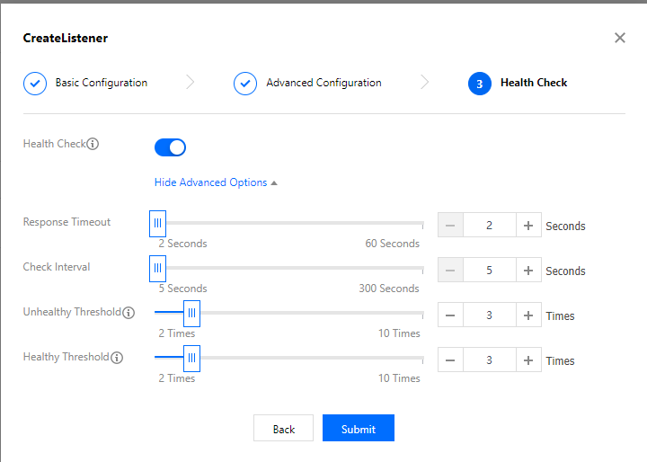 Verificação de integridade | Se deve ativar ou desativar a verificação de integridade. Em listeners TCP, as instâncias do CLB enviam pacotes SYN para portas de servidor especificadas, a fim de realizar verificações de integridade. | Ativada |