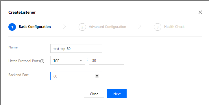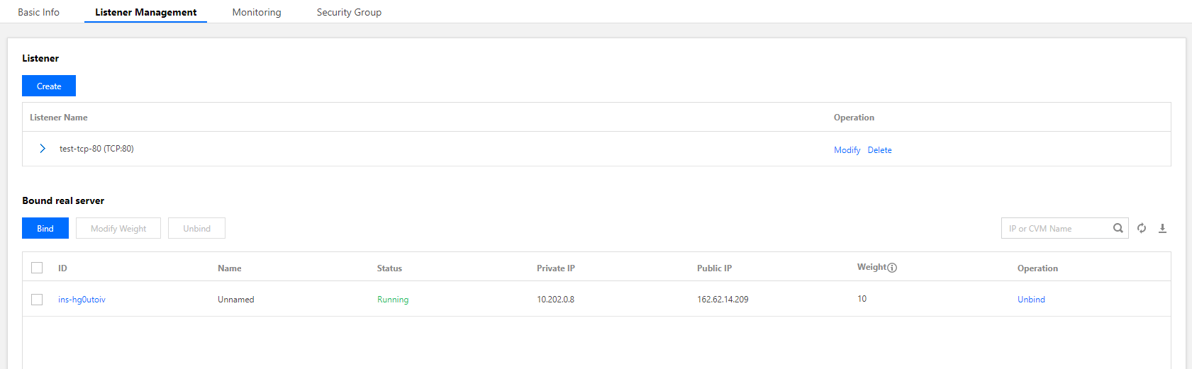 Portas do protocolo do listener | Protocolo do listener e porta de escuta Protocolo do listener: o CLB aceita protocolos como TCP, UDP, HTTP e HTTPS. Esse exemplo usa o TCP. Porta de escuta: usada para receber e encaminhar solicitações para servidores de back-end. O intervalo de portas é 1 a 65535. A porta de escuta deve ser exclusiva na mesma instância do CLB. | TCP:80 |