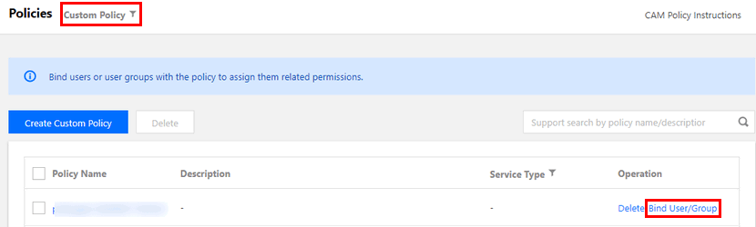 7. No topo da página da lista "Policy (Política)", selecione Custom Policy (Política personalizada), encontre a linha da política que você acabou de criar na lista e clique em Associate User/Group (Associar usuário/grupo) na coluna "Operation (Operação)".