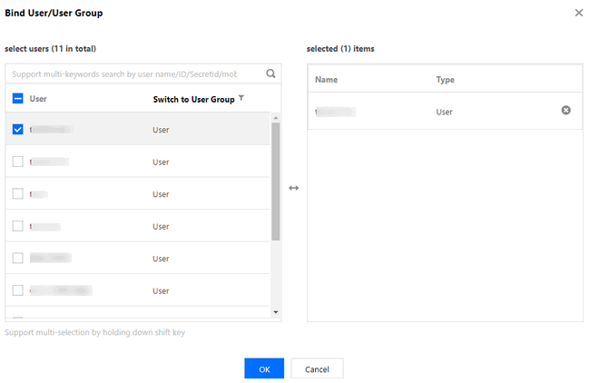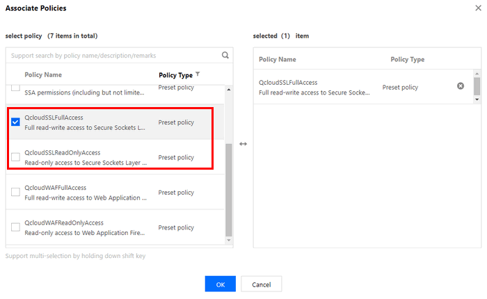 4. Na caixa pop-up, selecione QcloudSSLFullAccess ou QcloudSSLReadOnlyAccess e clique em OK.