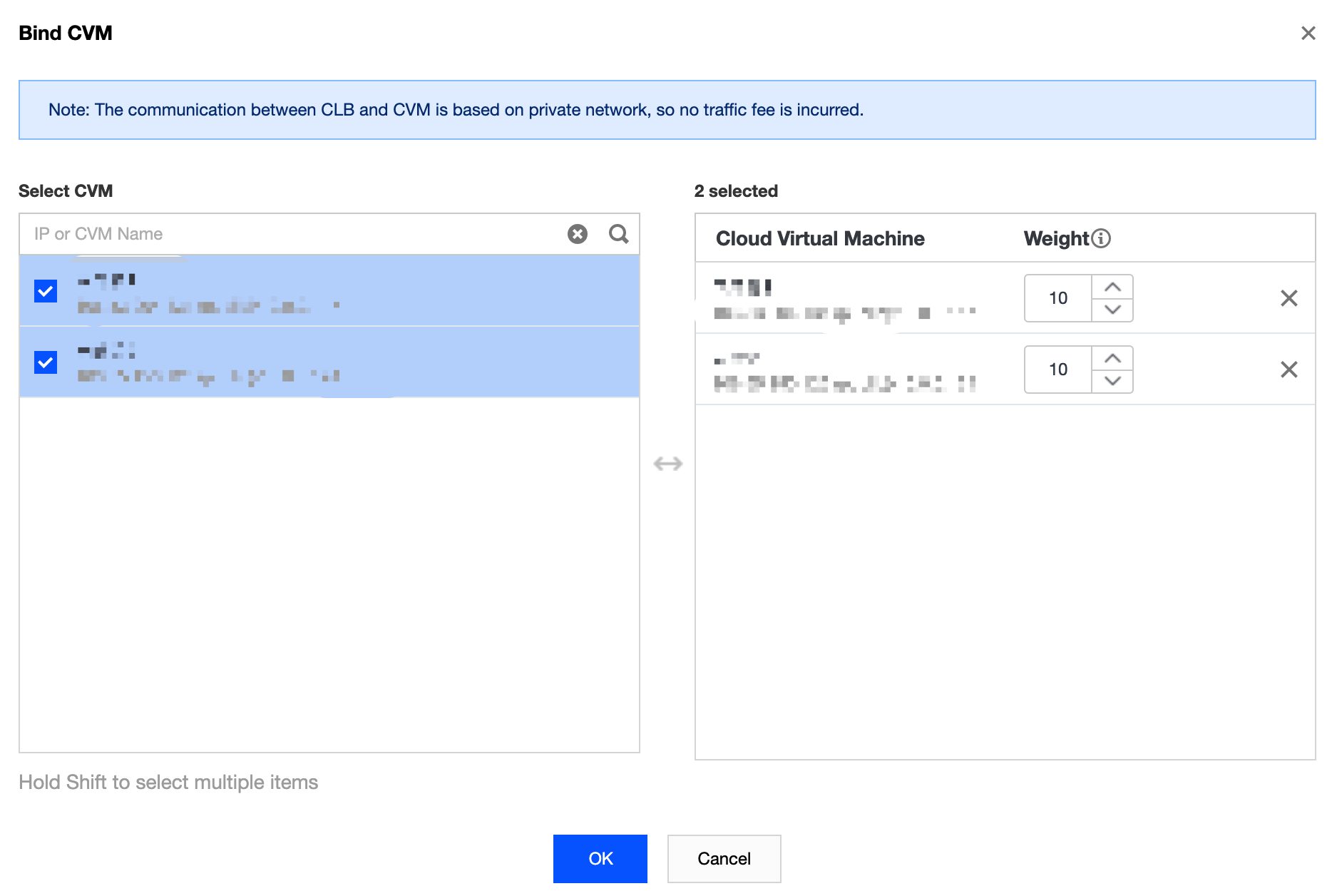 7. Na janela pop-up Bind CVM (Vincular CVM), selecione a instância do CVM a ser vinculada, insira o peso e clique em OK.